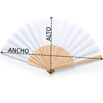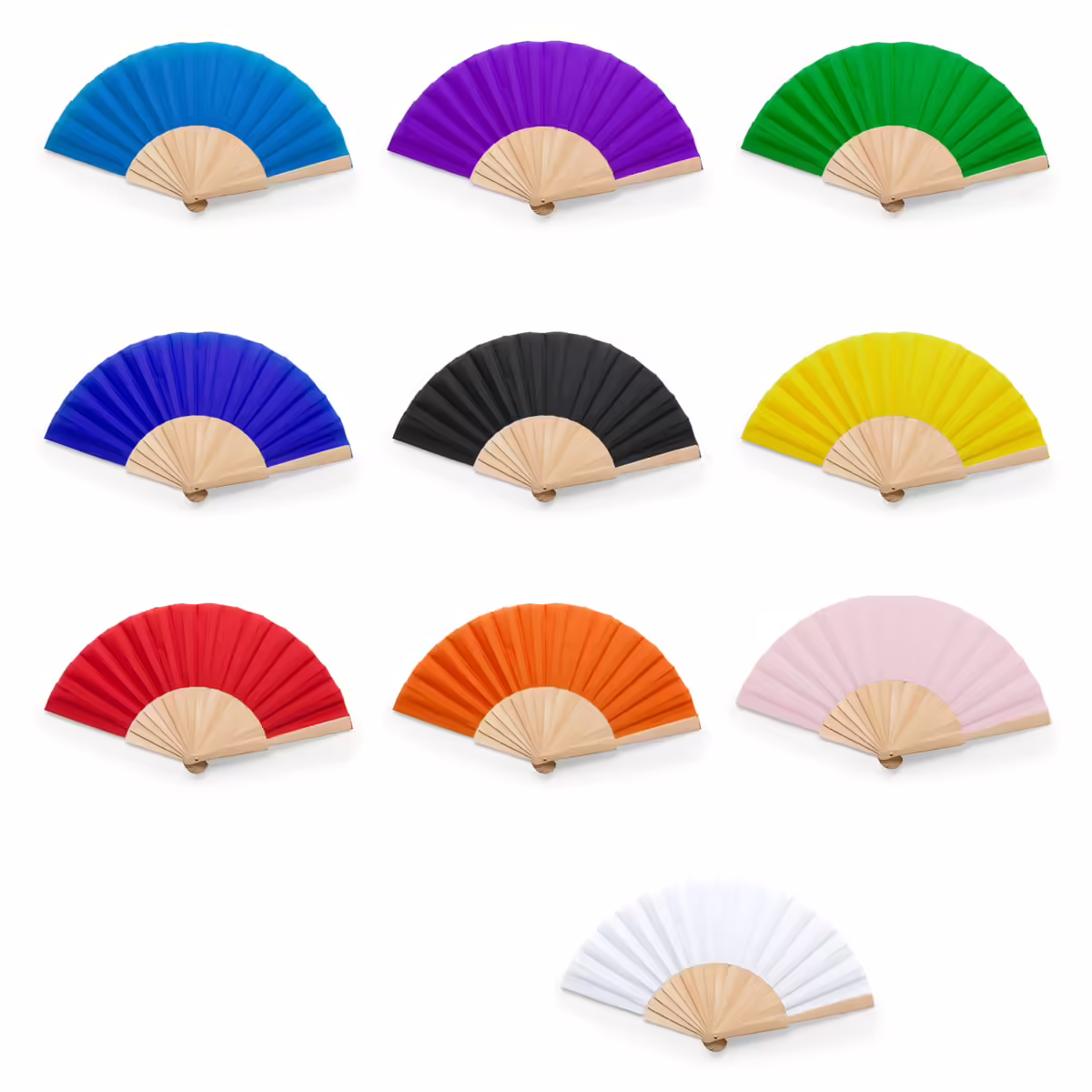 Abanico con varillas de madera y tela en poliéster. Presentación en caja blanca.