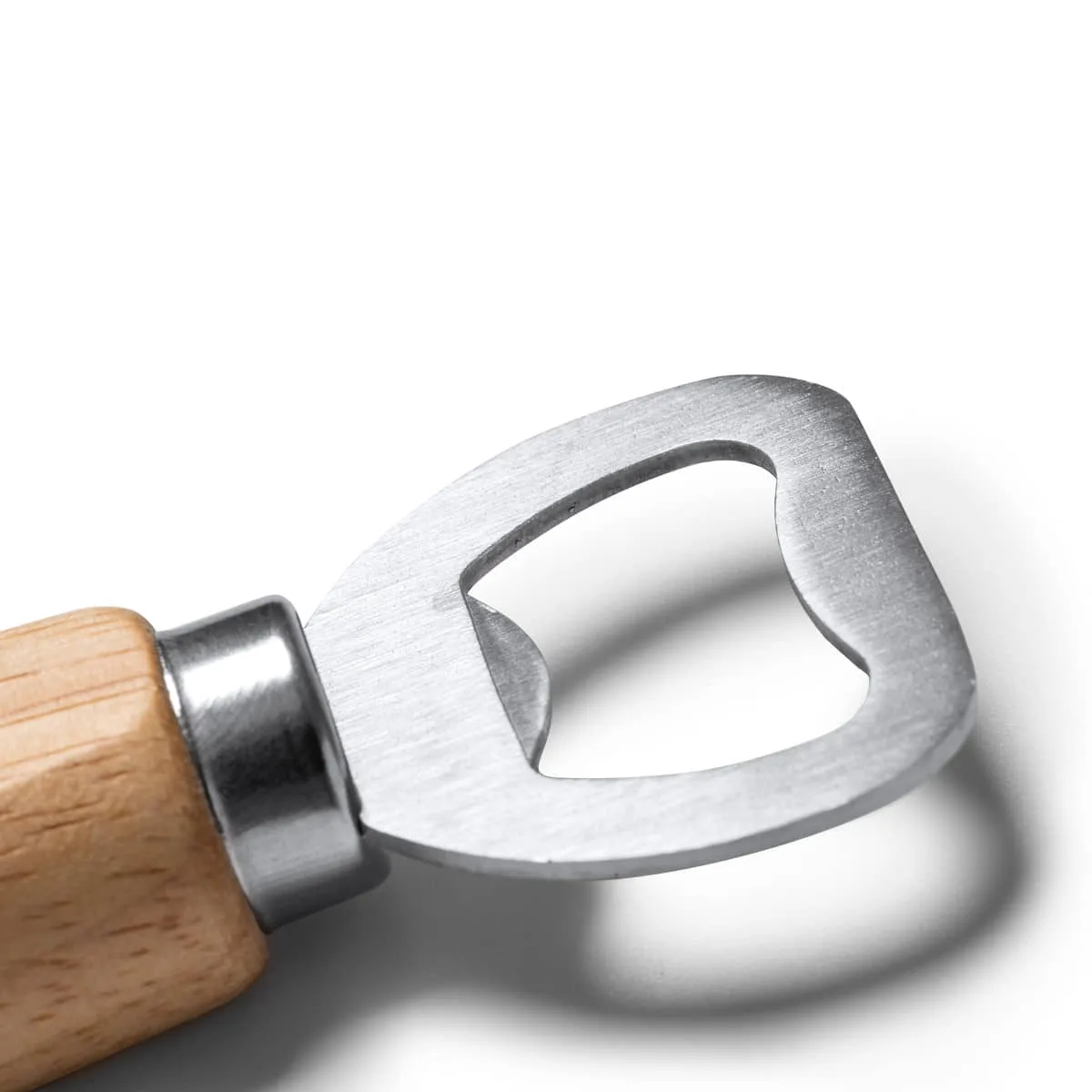 Abridor de acero inoxidable con empuñadura de madera natural.