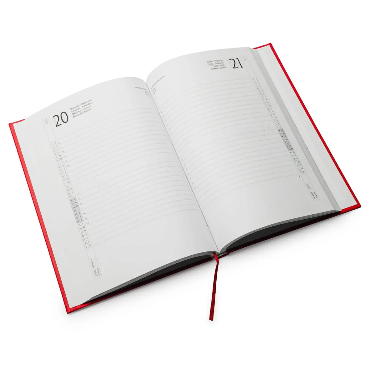 Agenda tamaño A5 con cubierta acolchada grabada en relieve. 320 páginas más 4 páginas con mapas. Marcador de páginas en color a juego con la portada. Gramaje del papel 60gsm. Impresión a color 2+2. Papel interior de color banco.