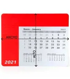 Alfombrilla rectangular para ratón con calendario. Cubierta de un color y transparente, tras la que se puede ver la hoja del mes correspondiente. La cubierta se levanta para acceder al calendario de 12 hojas en español e inglés, cuyas hojas se arrancan. E