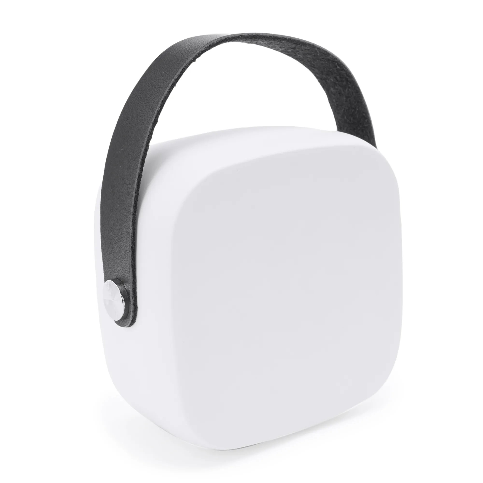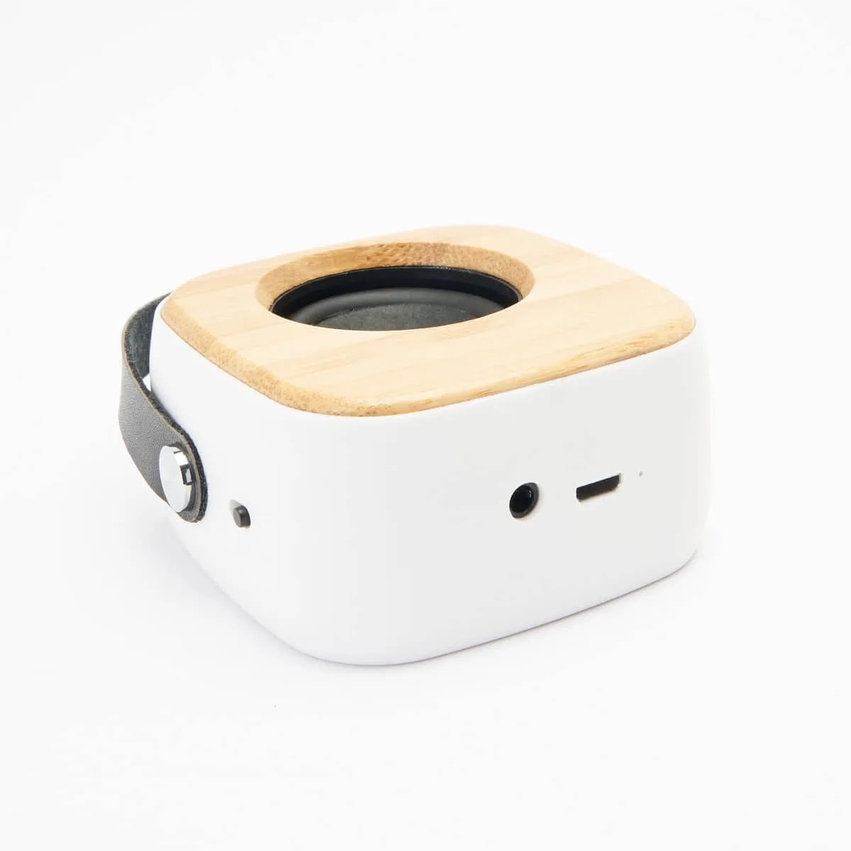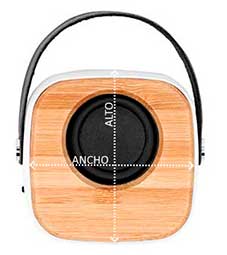 Altavoz inalámbrico Bluetooth con cuerpo de ABS, frontal de bambú natural y membrana visible. Incluye asa para transporte de polipiel. Potencia 3W. Batería recargable. Cable incluido. Presentación en caja diseño eco.
