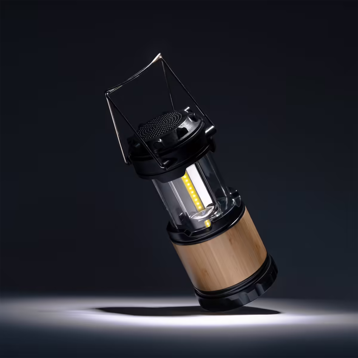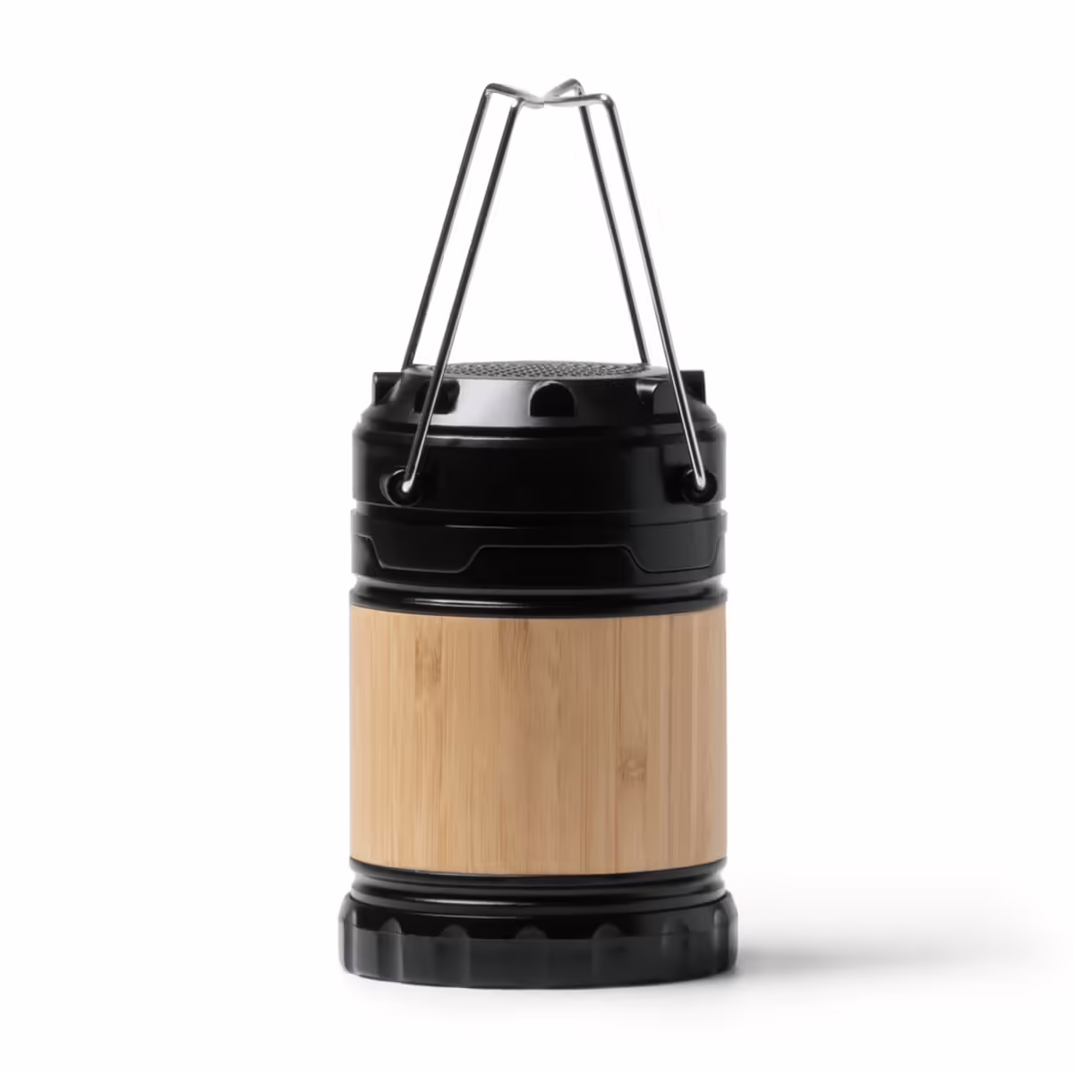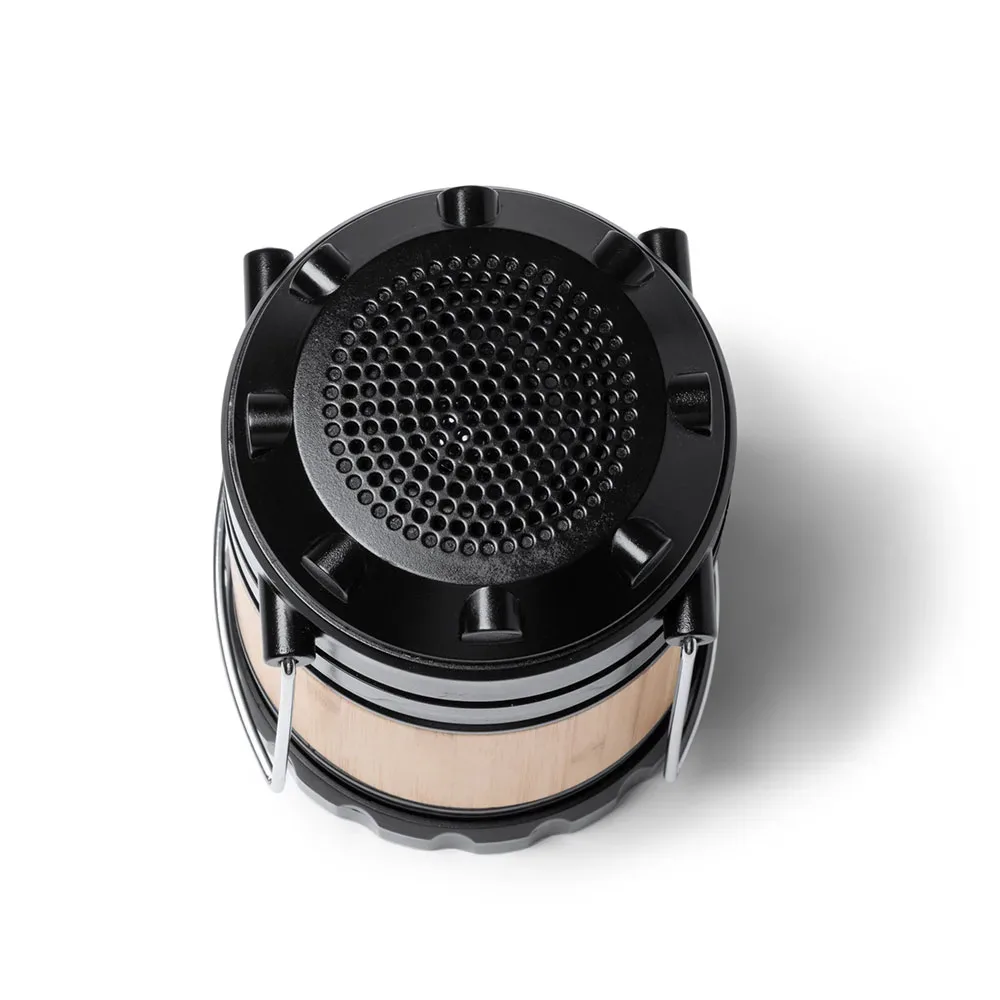 Altavoz inalámbrico 3W con función lámpara 230 lumen y cuerpo de bambú. 3 pilas AA incluidas. Prácticas asas de transporte. Cable Tipo C incluido.