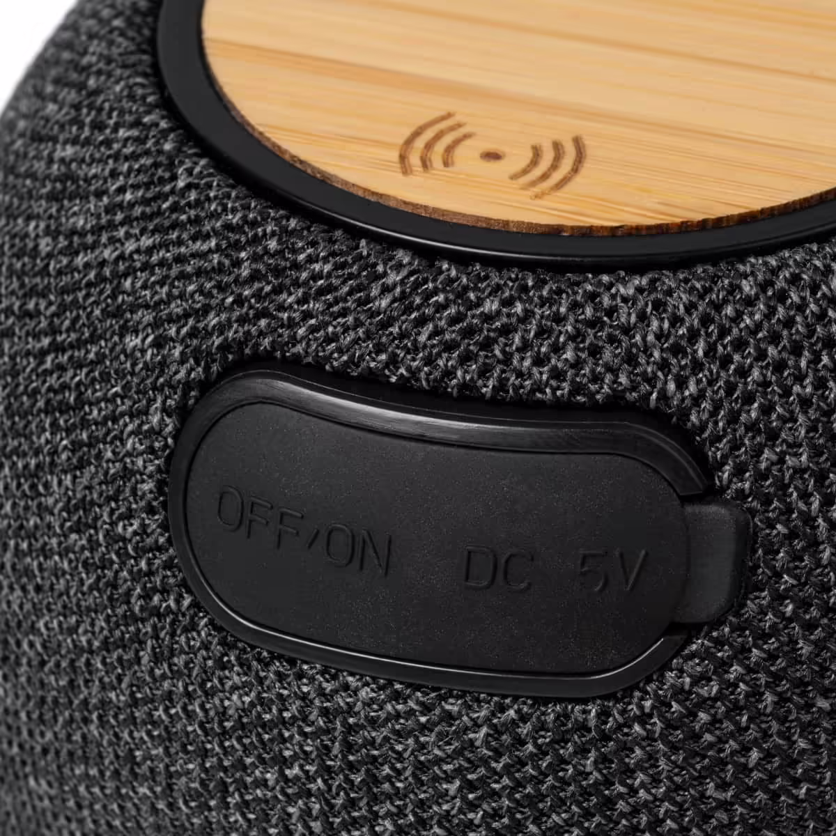 Altavoz inalámbrico redondo fabricado con cuerpo de bambú y poliéster reciclado RPET, con potencia de 5W y conexión Bluetooth. Distancia máxima de funcionamiento de hasta 10 metros y hasta 5 horas de funcionamiento continuo. Recargable mediante cable Tipo C. Con función de carga inalámbrica en la superficie de bambú, con 15W de potencia para recarga de dispositivos provistos de esta tecnología. Con indicador luminoso de carga. Presentación en caja diseño eco.