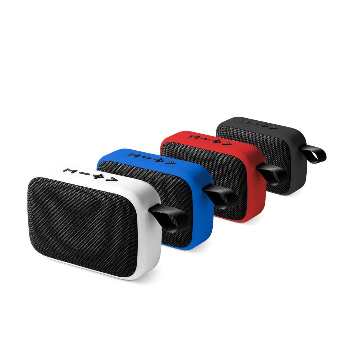 Altavoz inalámbrico Bluetooth bicolor. Cuerpo en acabado mate de tacto goma. Asa de transporte, botones y tela a juego. Potencia 3W. Batería recargable. Cable incluido. Presentación en caja diseño.