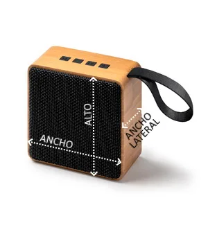 Altavoz inalámbrico realizado con materiales ecológicos en el cuerpo de bambú y tejido RPET. Potencia 3W y batería recargable. Conexión Tipo C. Cable incluido.