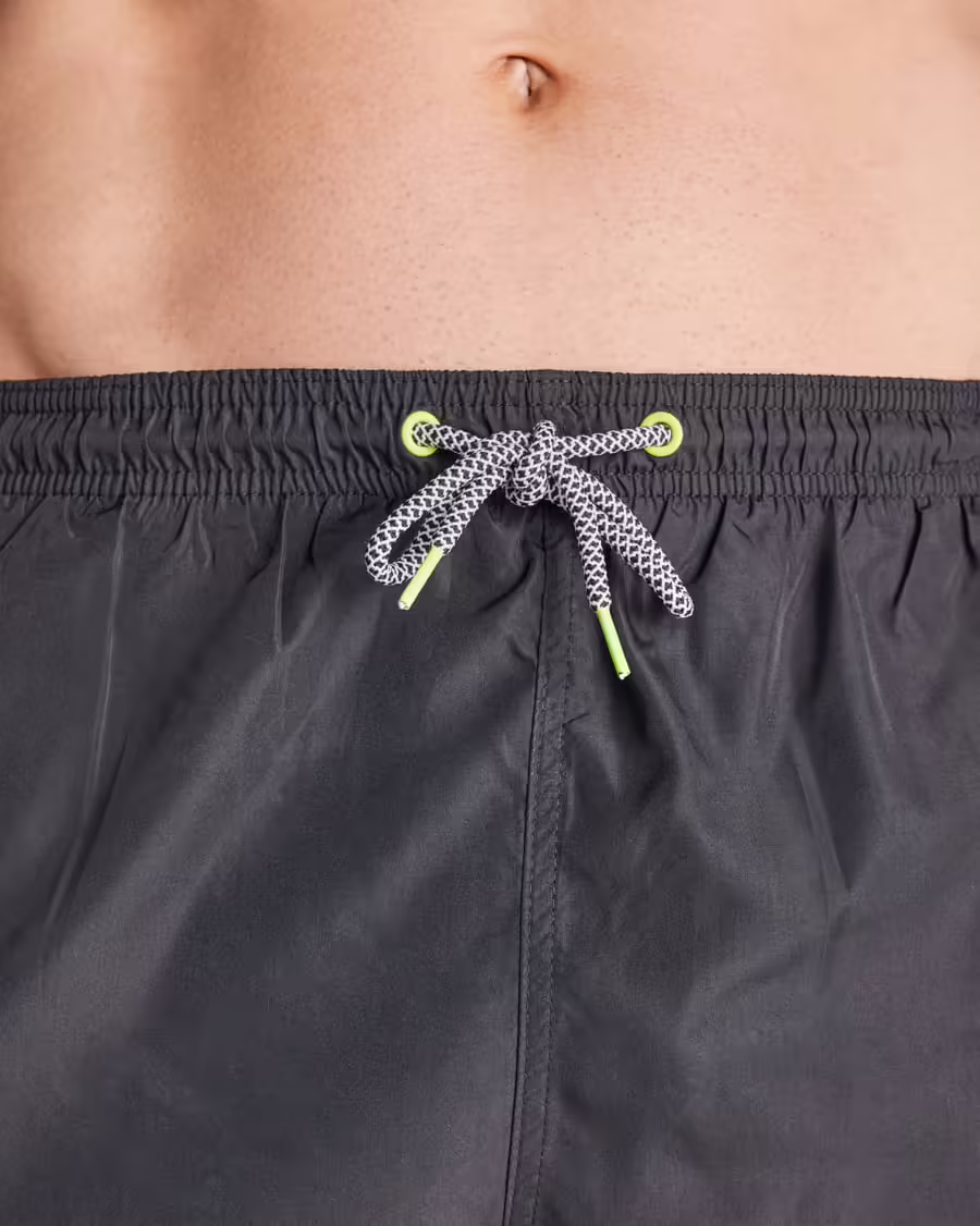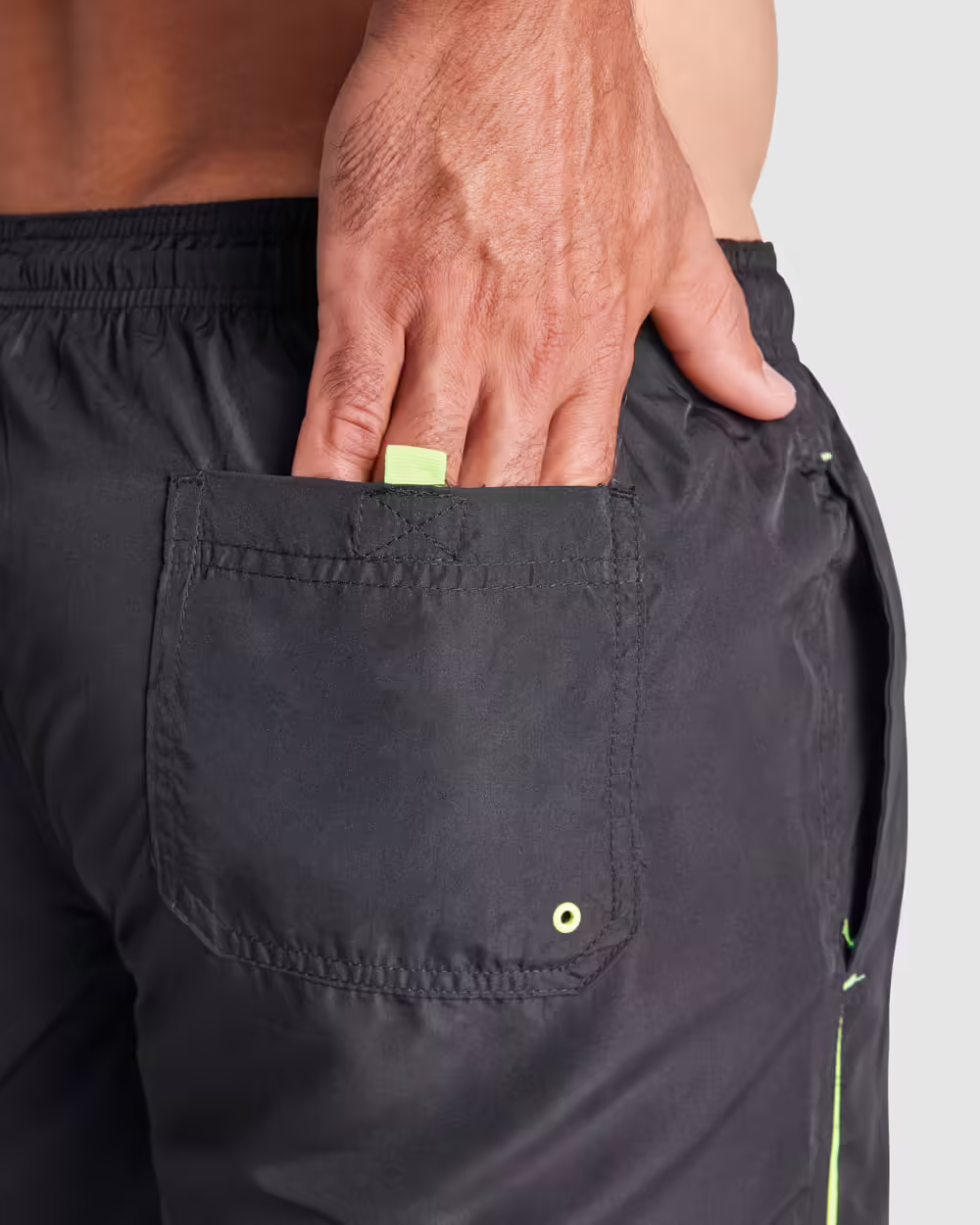 Bañador con detalles a contraste y dos bolsillos laterales. Cinturilla elástica con cordones decorativos ajustables y ojales metálicos a contraste. Laterales con vivo a contraste. Bolsillo trasero con ojal de desagüe. Slip interior.