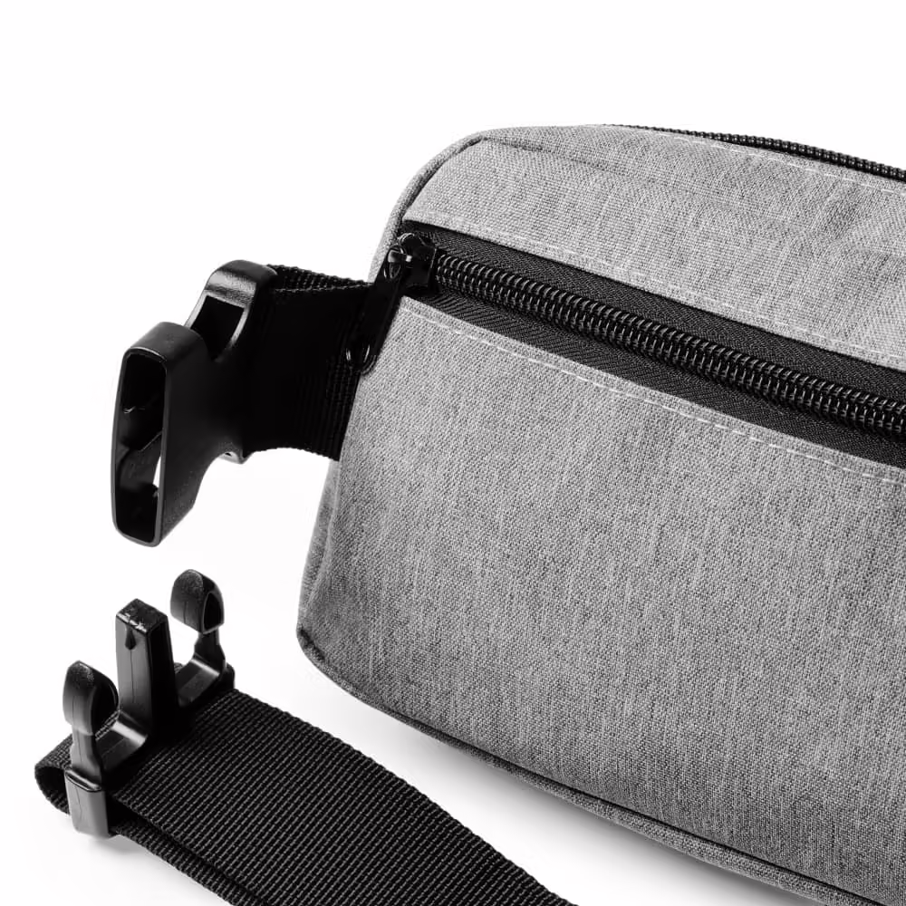 Cómoda riñonera realizada en 300D RPET con bolsillo frontal, una opción funcional y sostenible. Cuenta con un cierre de hebilla que hace más fácil y versátil su uso. Además, tiene un compartimento principal y otro adicional en la parte interna para el almacenaje de objetos más pequeños.