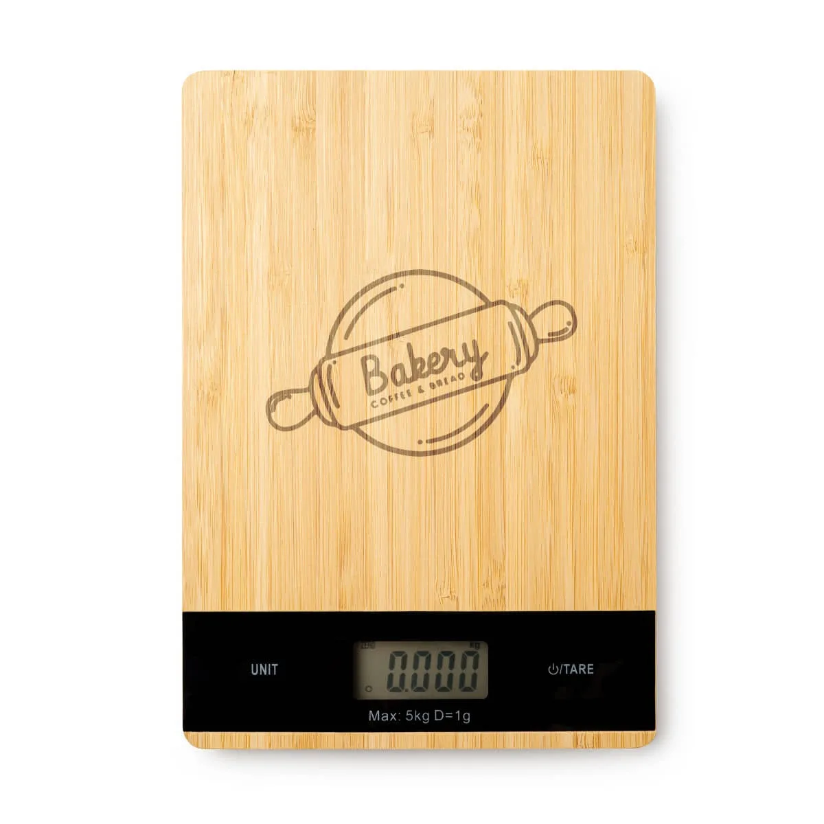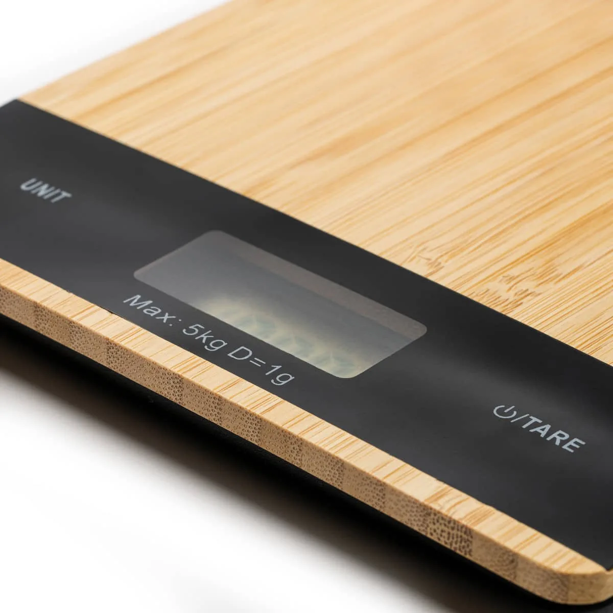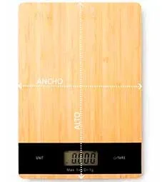 Báscula de cocina digital con carcasa frontal de bambú natural. Ideal para pesar los ingredientes y los alimentos cuando cocines tus mejores recetas. Con una capacidad máxima de 5 kg. Funciona con una pila incluida.