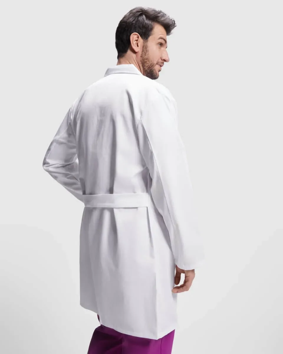 Nuestra bata de servicios “Vaccine” es una bata Unisex de manga larga con cuello con solapa, apertura central con 5 botones a tono, un bolsillo en el pecho y dos laterales, y cinturilla trasera.