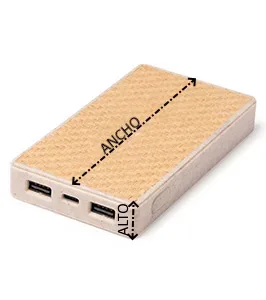 PRODUCTO QUE SE DESCATALOGARÁ CUANDO SE AGOTEN LAS EXISTENCIAS – Batería externa realizada en cuerpo de fibra de trigo y base de fibras naturales. Capacidad 10000 mAh. Entrada Tipo C. Salida Tipo C y 2 USB. Incluye cable.