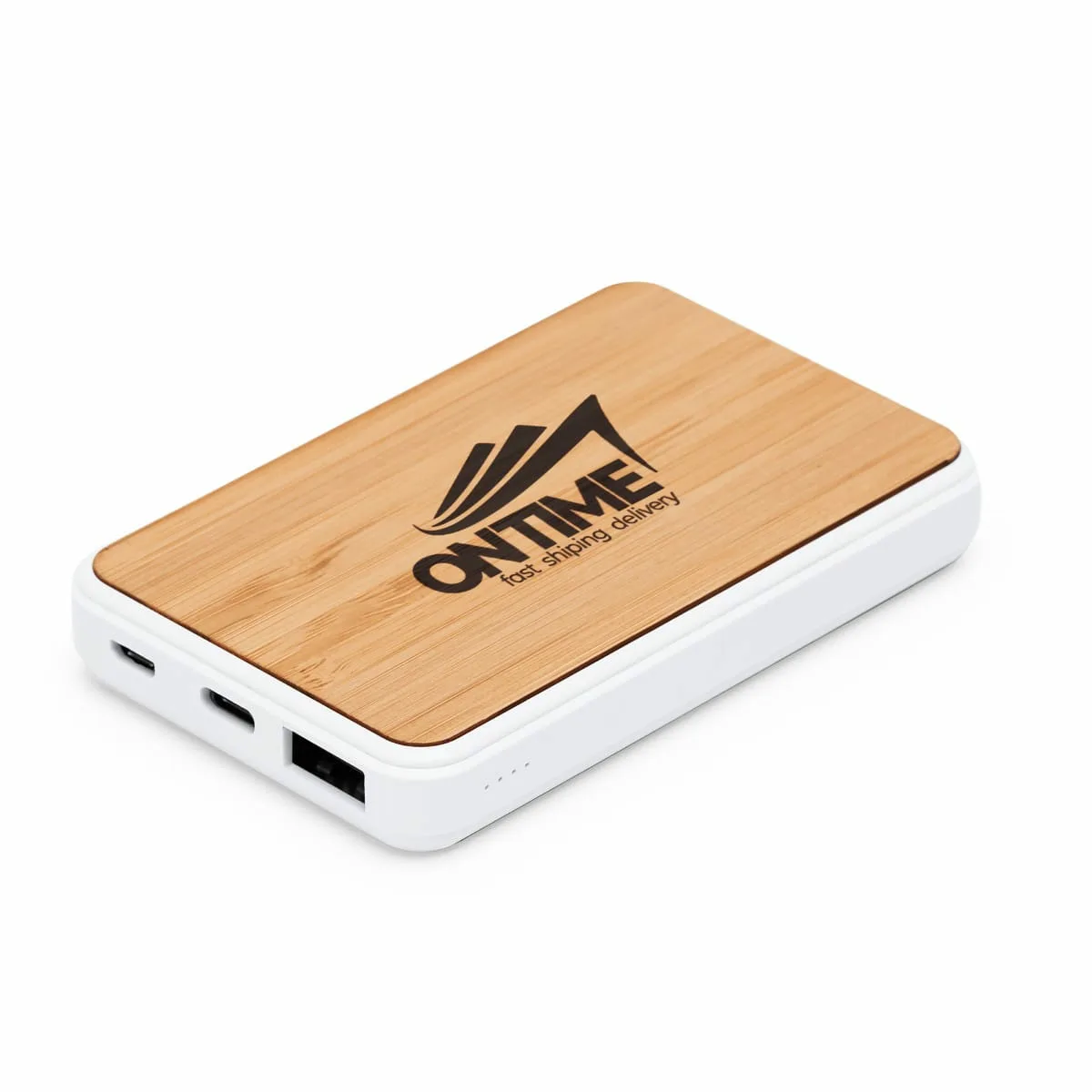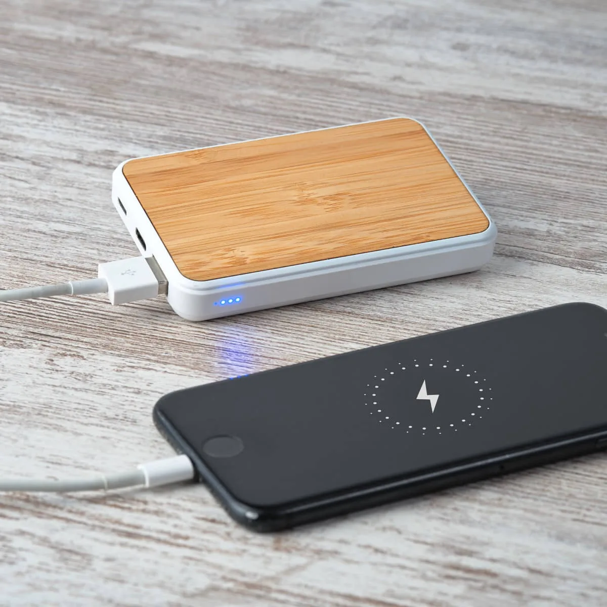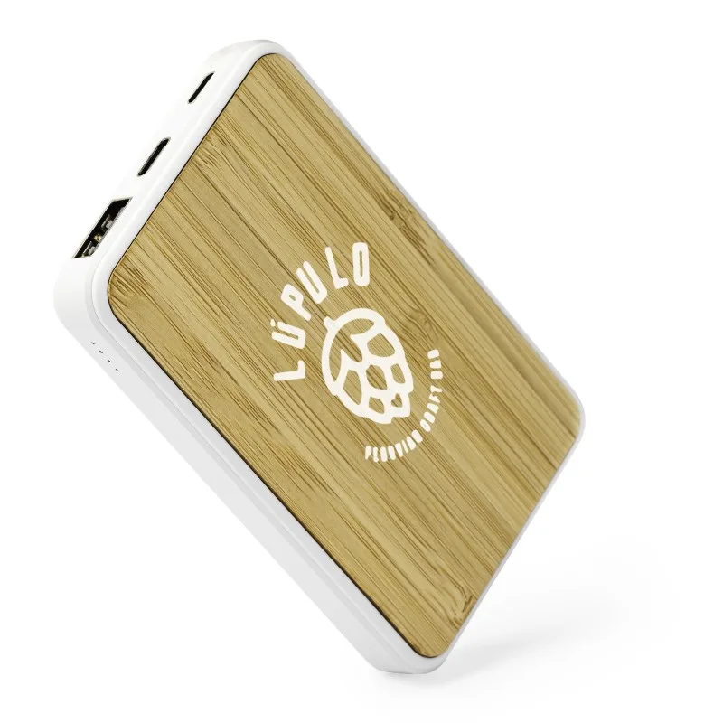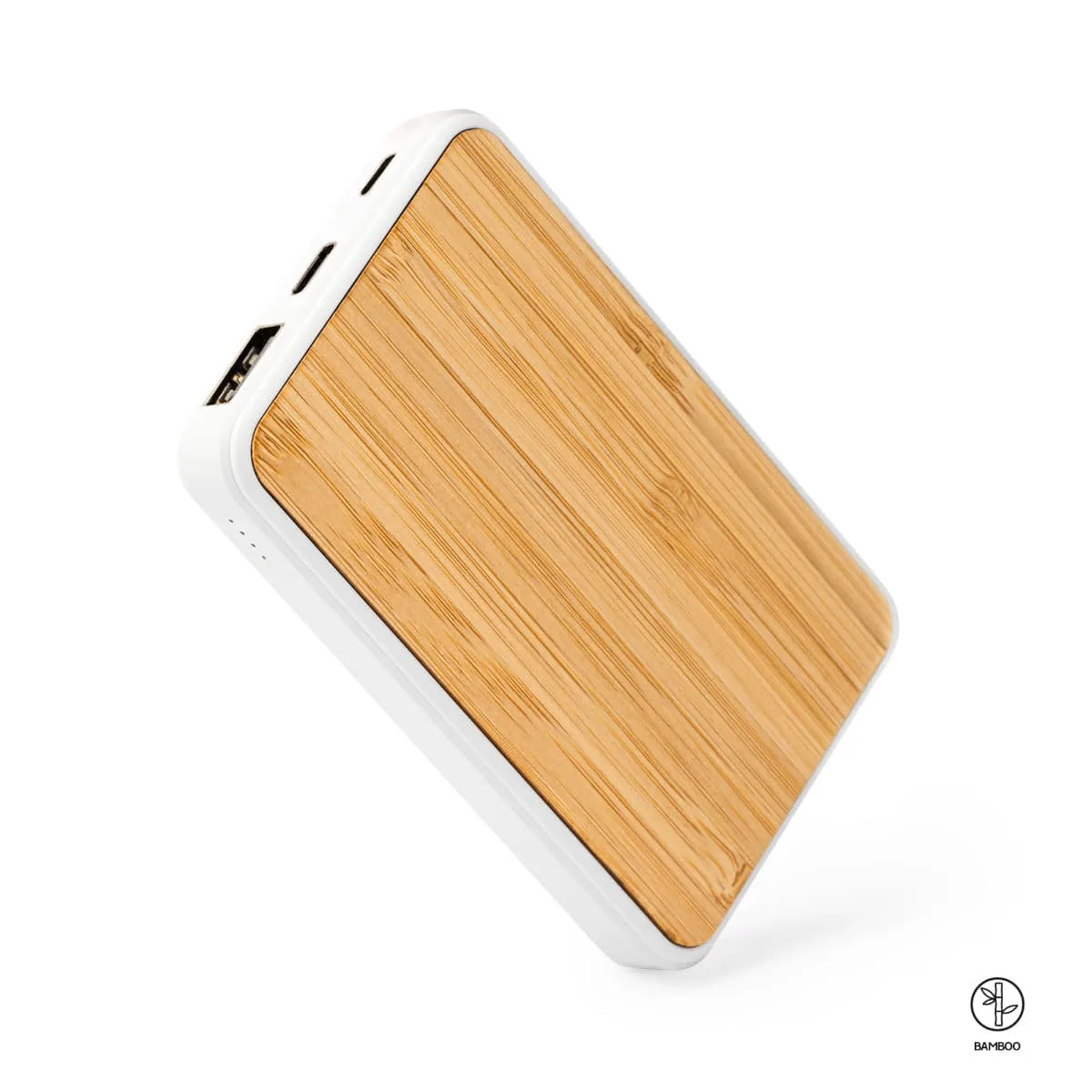 Batería externa de 5.000 mAh, con cuerpo rectangular de ABS blanco y superficie de bambú. Salida corriente USB DC5V/2.1A. Incluye cable Micro USB.