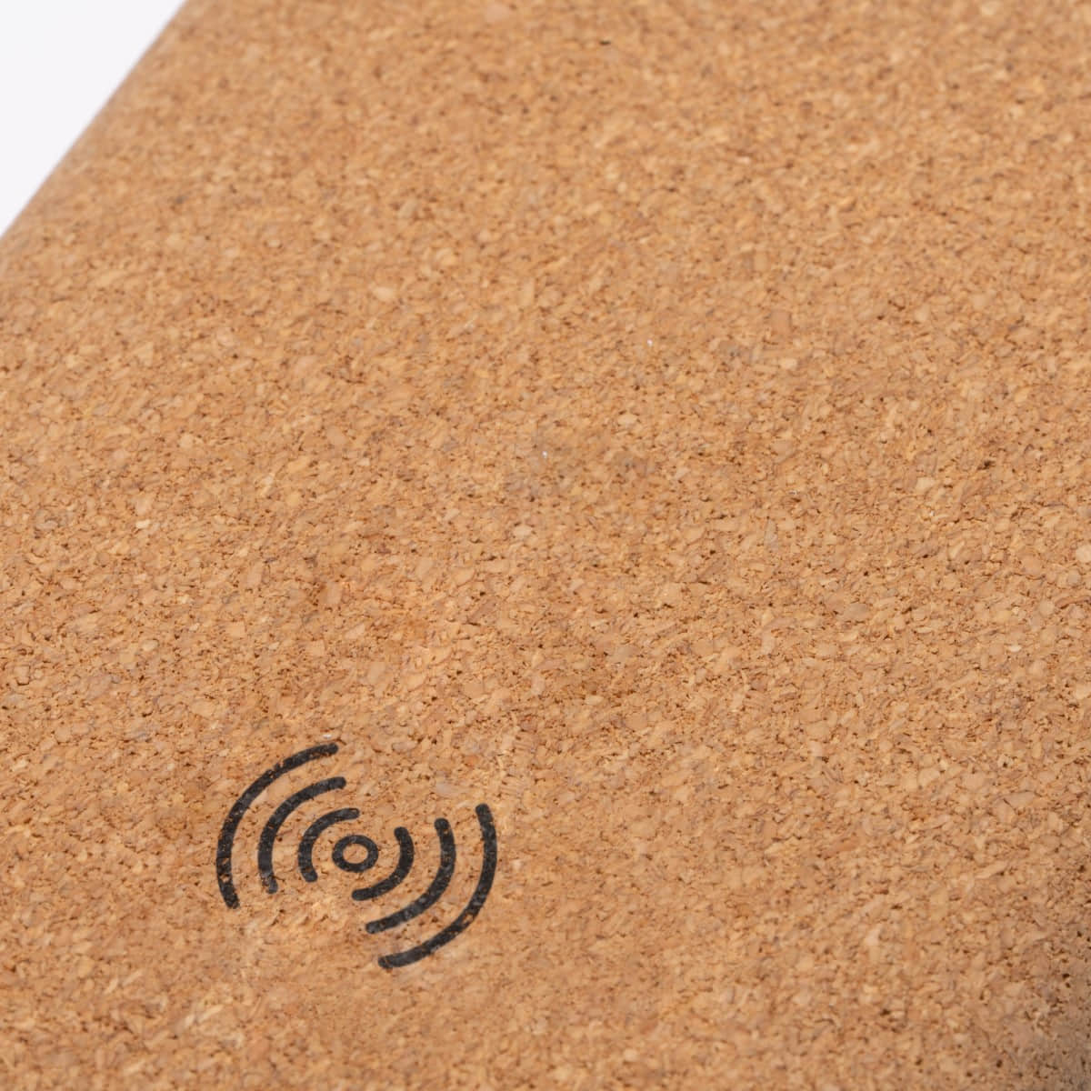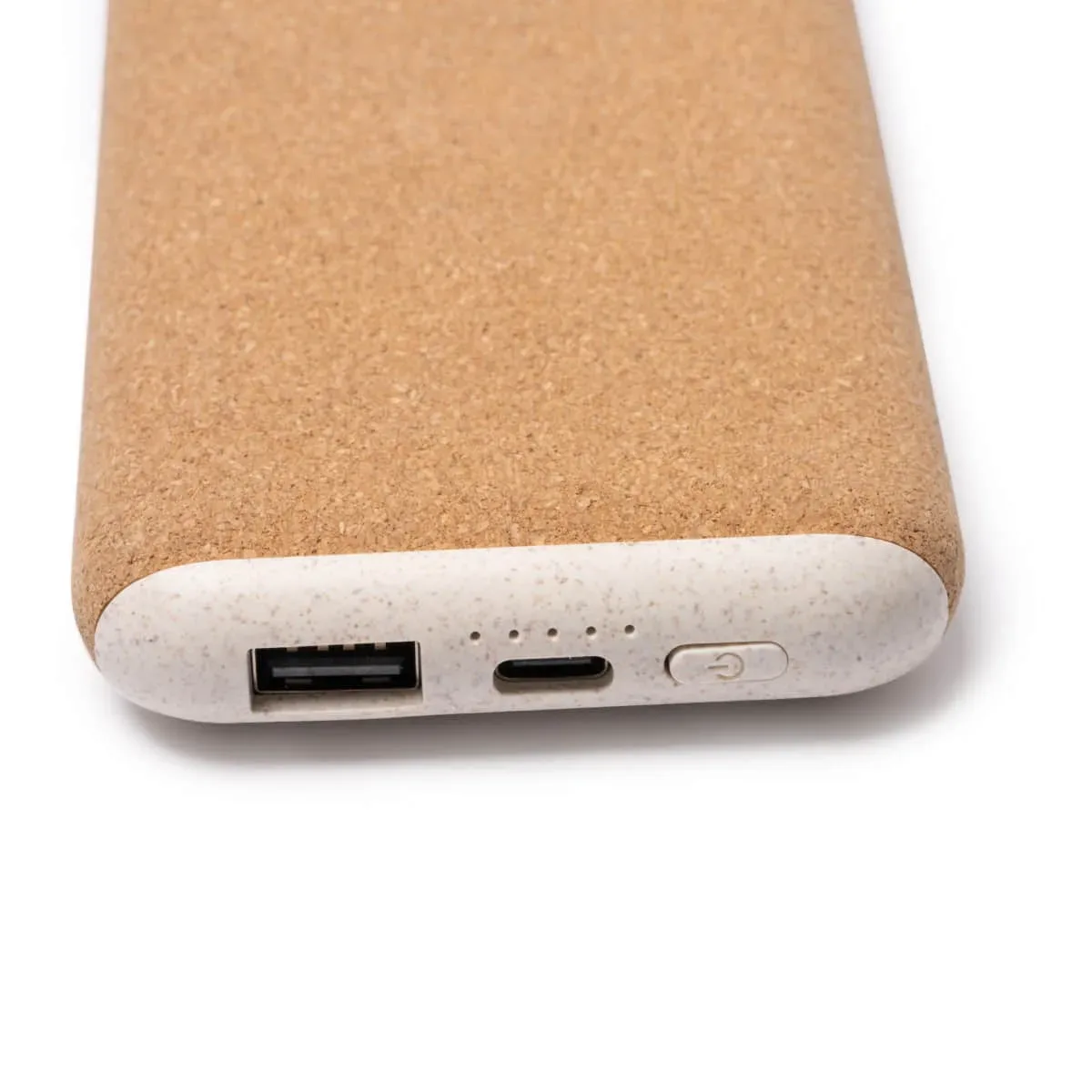 Batería externa con cuerpo de corcho y fibra de trigo. Capacidad 10.000 mAh. Carga rápida inalámbrica 15W. Salida de corriente Tipo C y USB 20W. Incluye cable Tipo C.