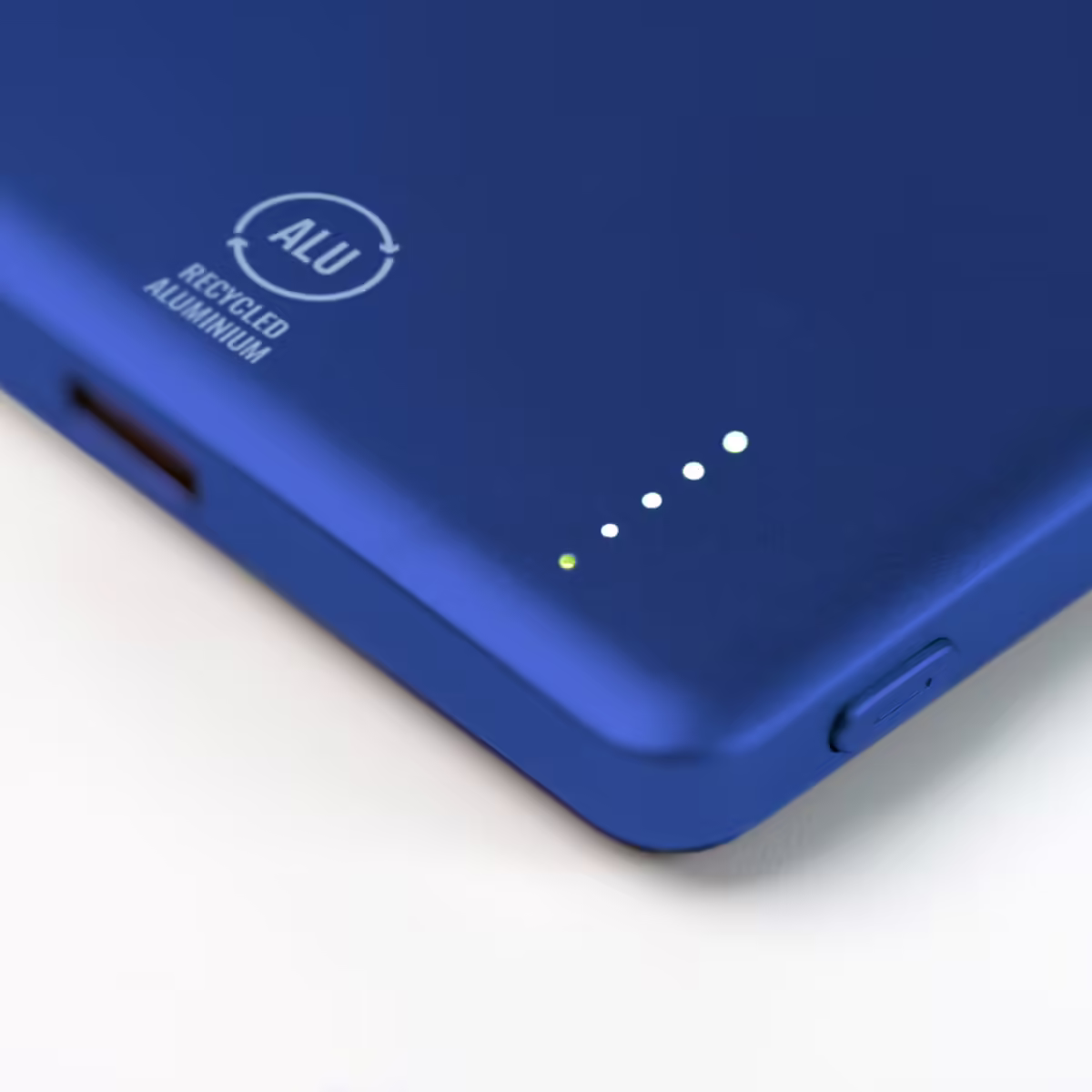 Batería externa magnética de 5000 mAh, elaborada en de aluminio reciclado. Con función de carga inalámbrica para dispositivos provistos de esta tecnología. Salida corriente inalámbrica de hasta 15W para Android y 7.5W para IOS. Cuenta con indicador luminoso de carga. Incluye cable tipo C y anillo magnético universal.