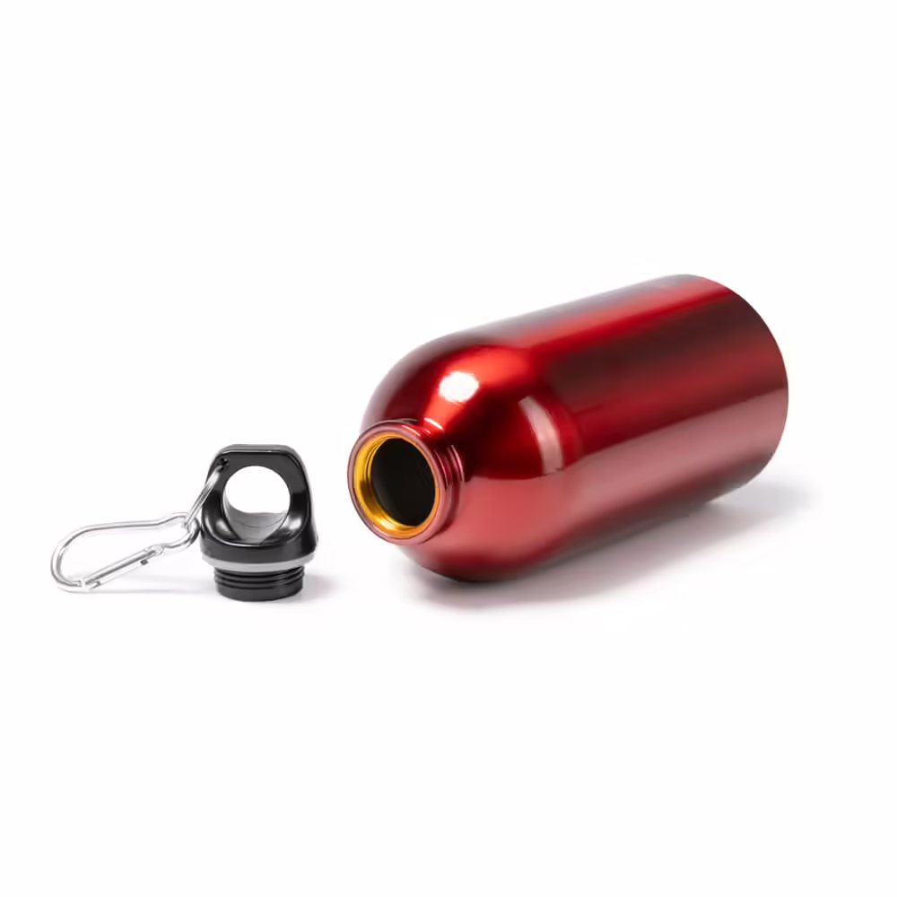 Bidón de acero inoxidable 304 reciclado. Con capacidad para 500 ml. Cuenta con tapón a rosca con silicona para evitar el goteo de las bebidas. Incorpora también un mosquetón en el tapón para hacer más fácil su transporte. Color blanco apto para sublimación.
