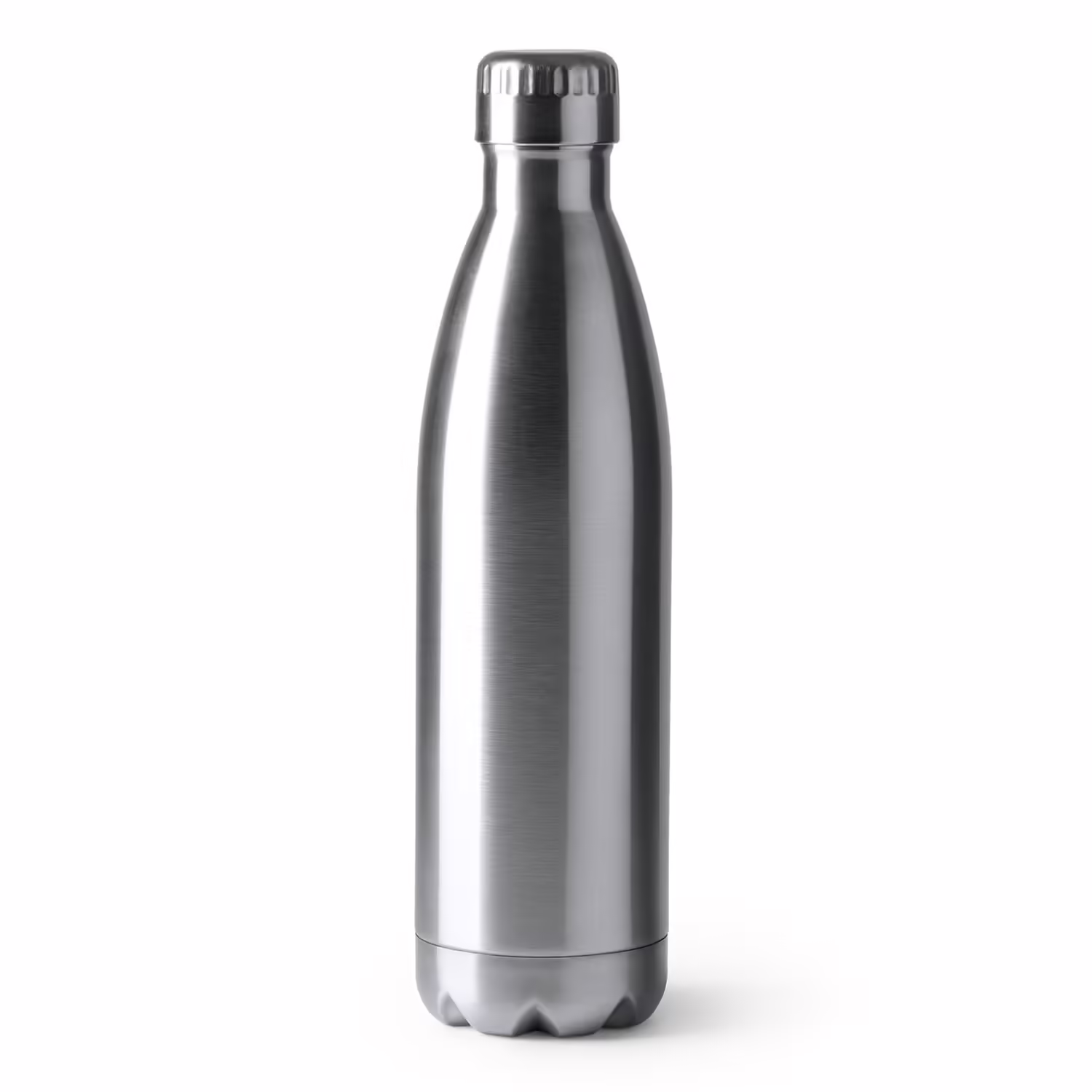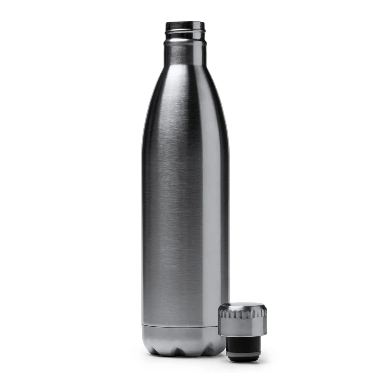 Bidón de acero inoxidable 304 con doble pared. Capacidad de 850 ml. Con tapón a rosca con relieve, también en acero inoxidable. Realiza tus diseños en este bidón con acabado brillante.