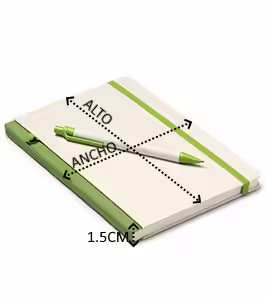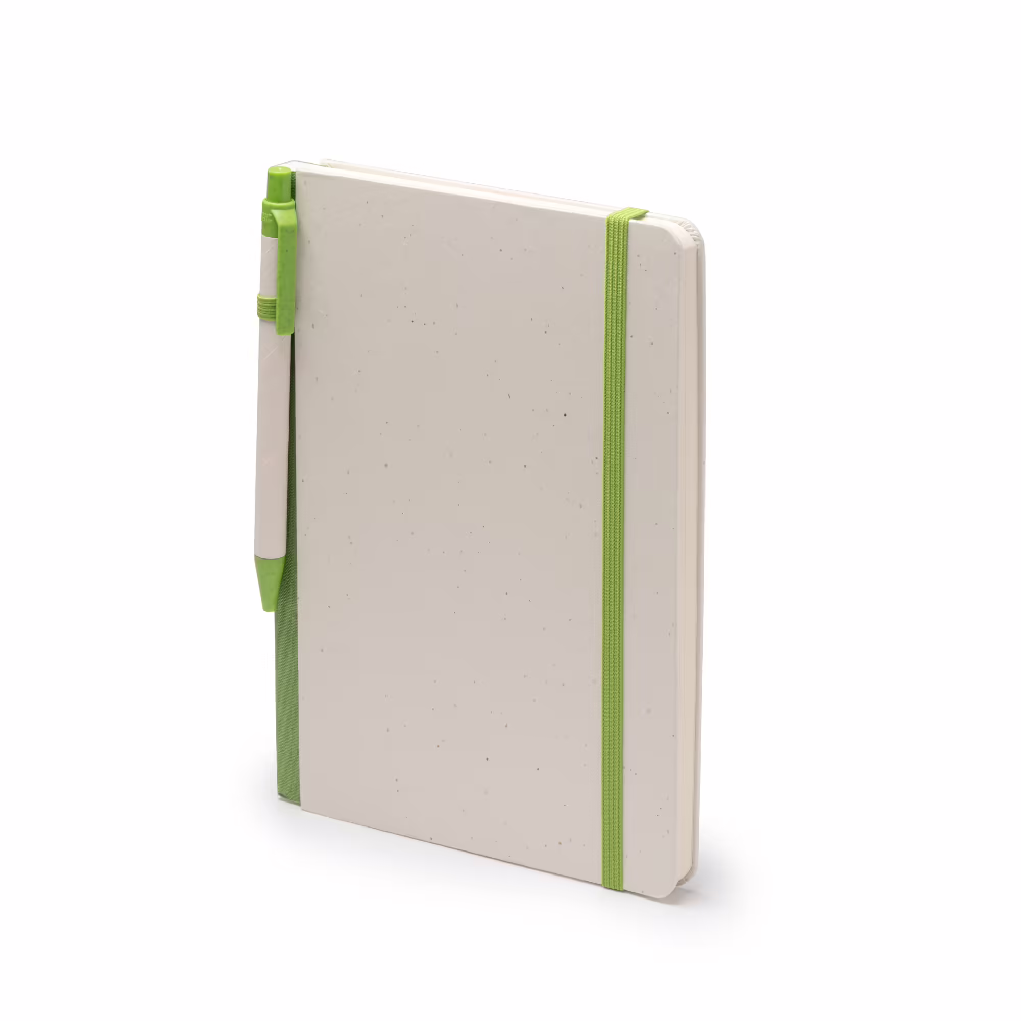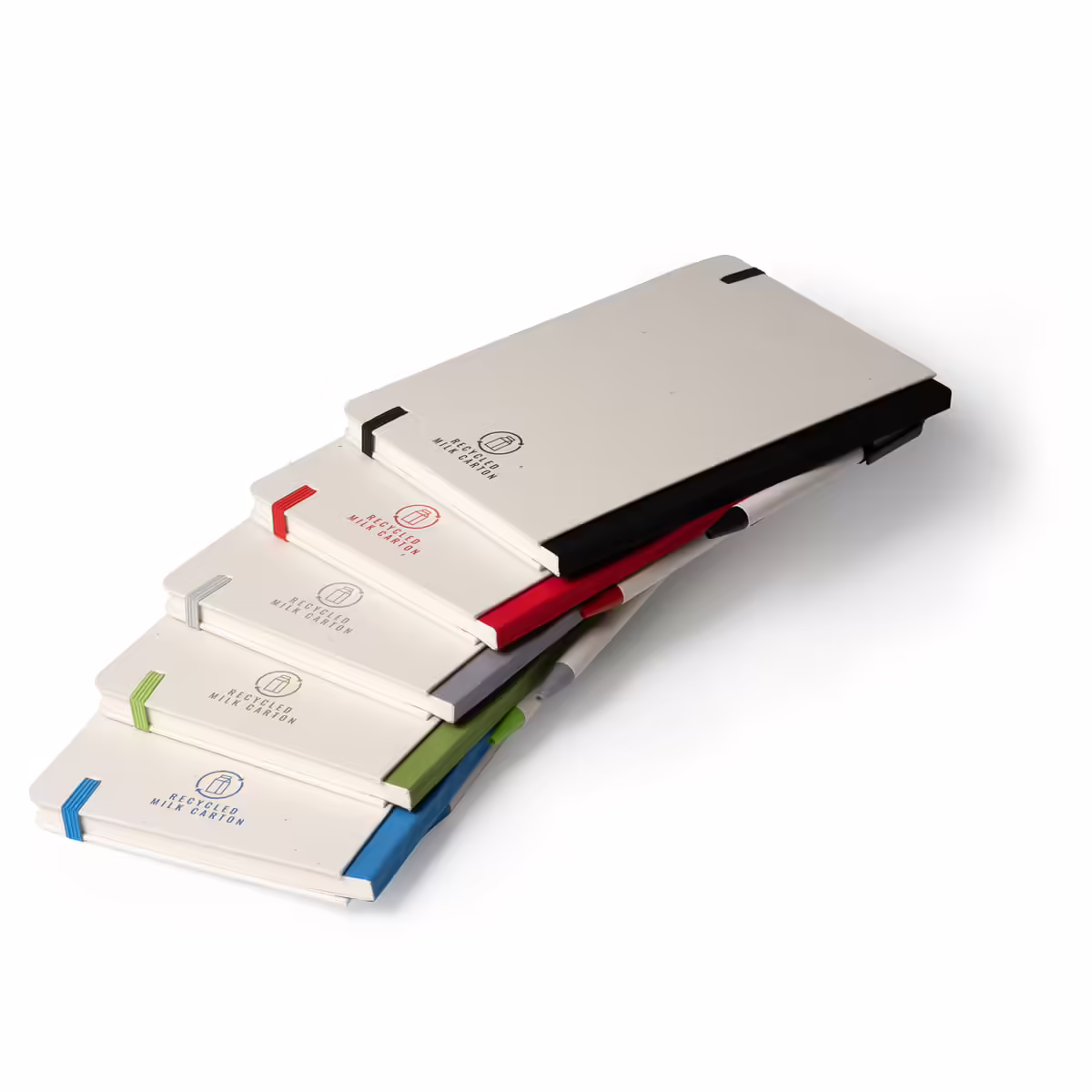Bloc de notas A5 fabricado en cartón reciclado de briks de leche, destacando por su enfoque ecológico y sostenible. La tapa rígida cuenta con una banda elástica y un marca páginas, ambos a juego con el color del bolígrafo pulsador de tinta azul incluido. Contiene 80 hojas lisas, ofreciendo un amplio espacio para anotaciones y dibujos. Ideal para uso diario, combina funcionalidad, estilo y responsabilidad ambiental.