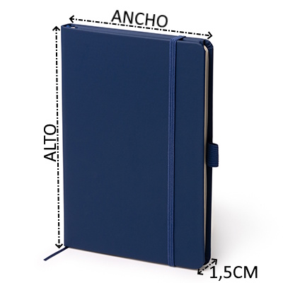 Bloc de notas tamaño A5 elaborado en PU reciclado de hojas lisas con soporte imantado para smartphone y bolígrafo. Cuenta con marcapáginas, cierre elástico y soporte para bolígrafo en el lateral en color a conjunto del exterior de la libreta.