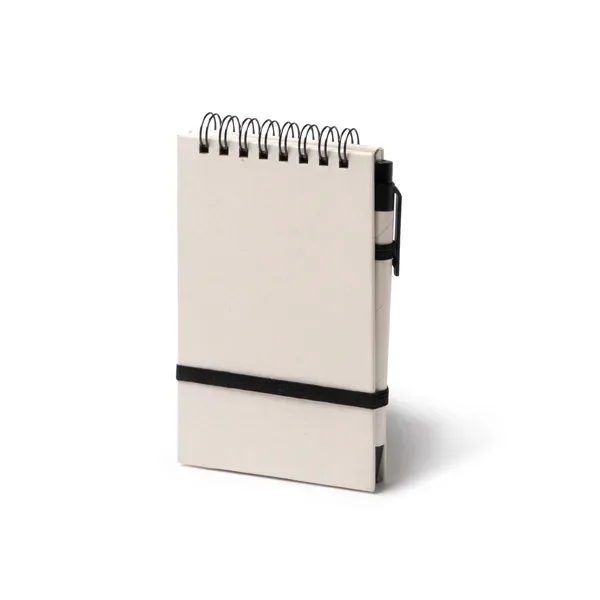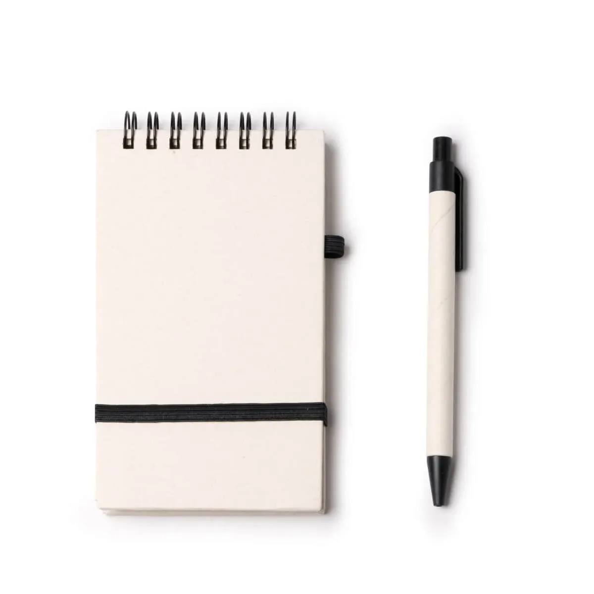 Libreta A5 realizada en cartón reciclado de brics de leche. Incluye banda elástica y bolígrafo de tinta azul. 80 hojas a rayas.