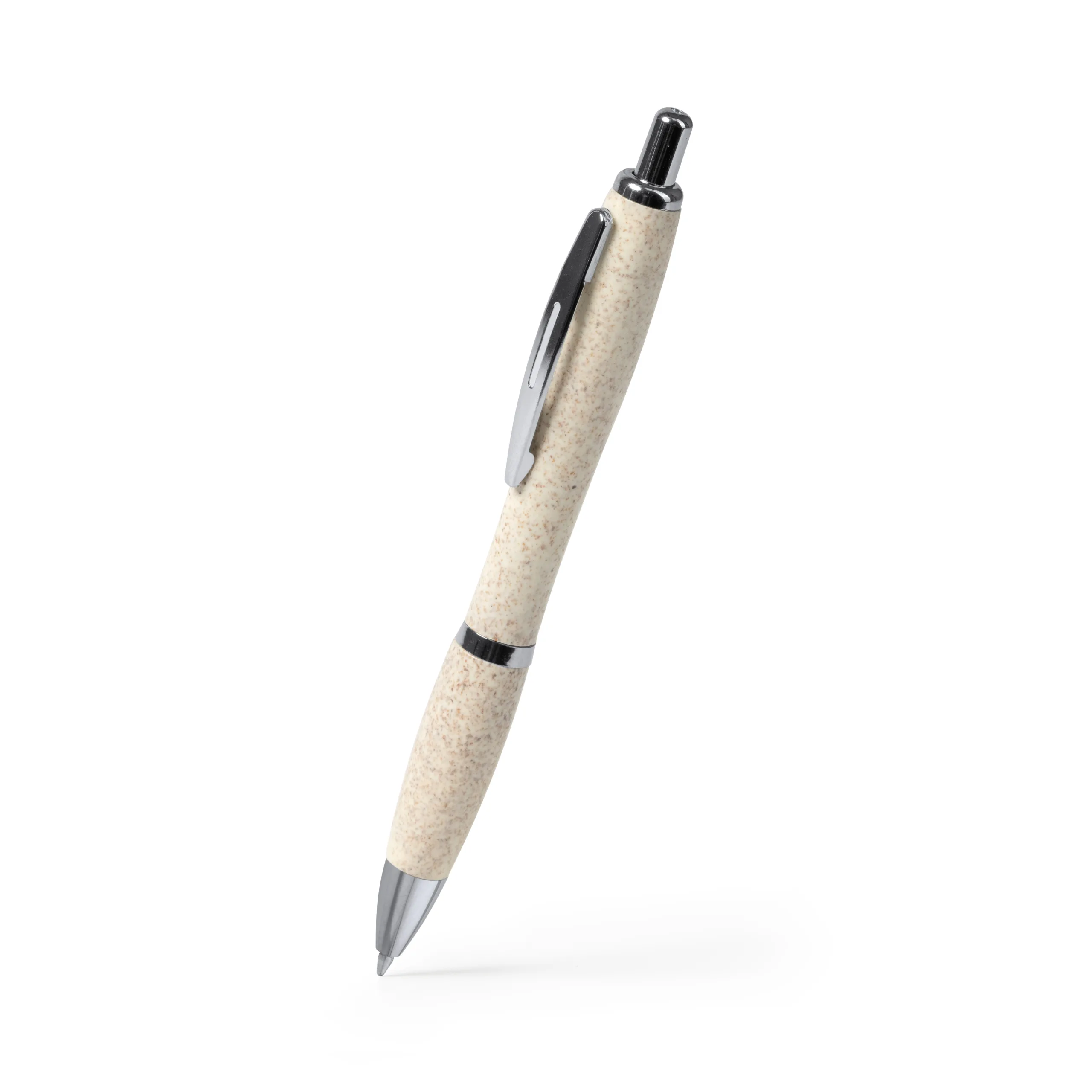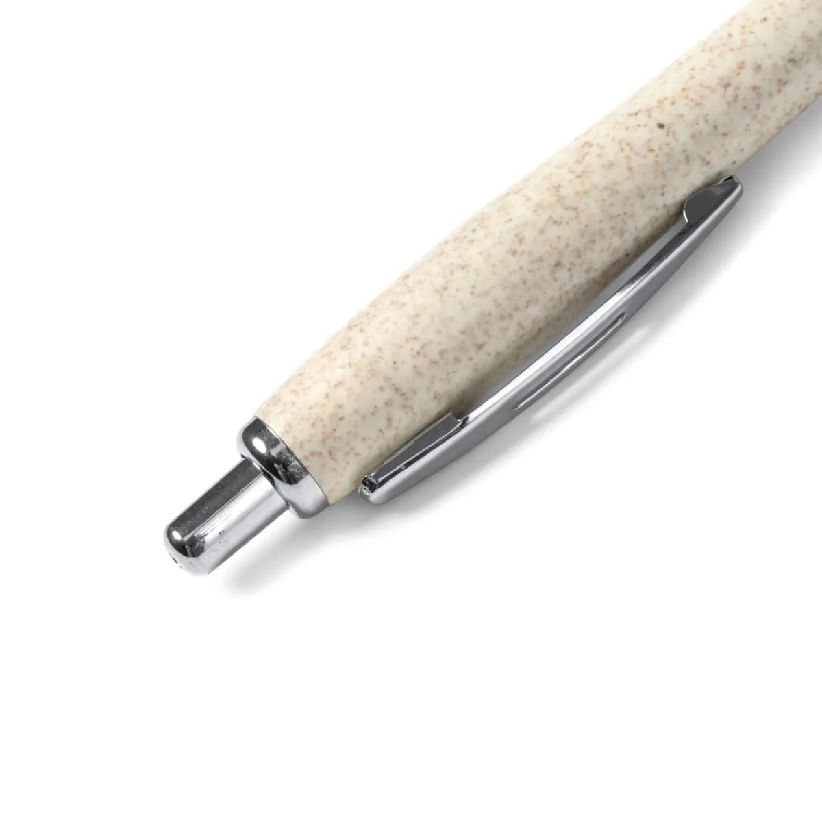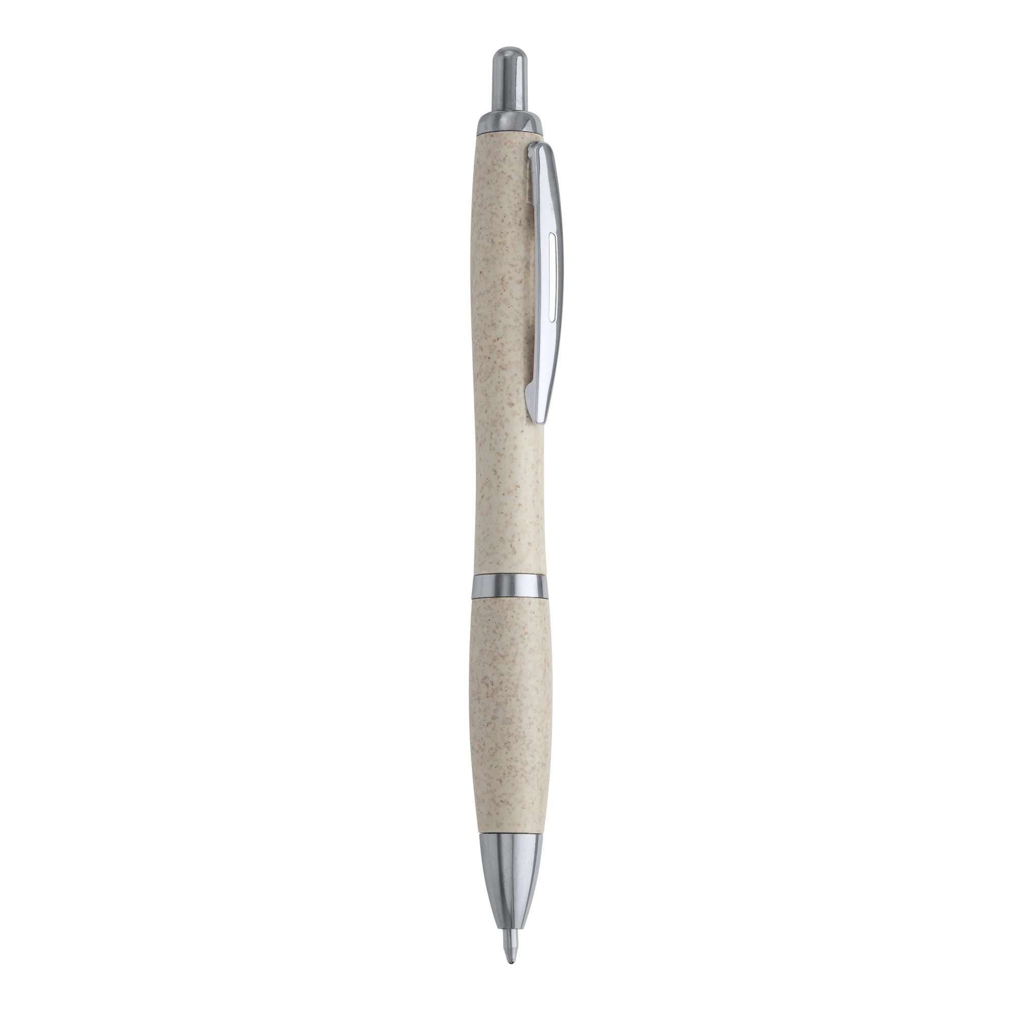 PRODUCTO QUE SE DESCATALOGARÁ CUANDO SE AGOTEN LAS EXISTENCIAS – Bolígrafo con pulsador de fibra de trigo y ABS. Detalles con acabados cromados. Tinta azul.
