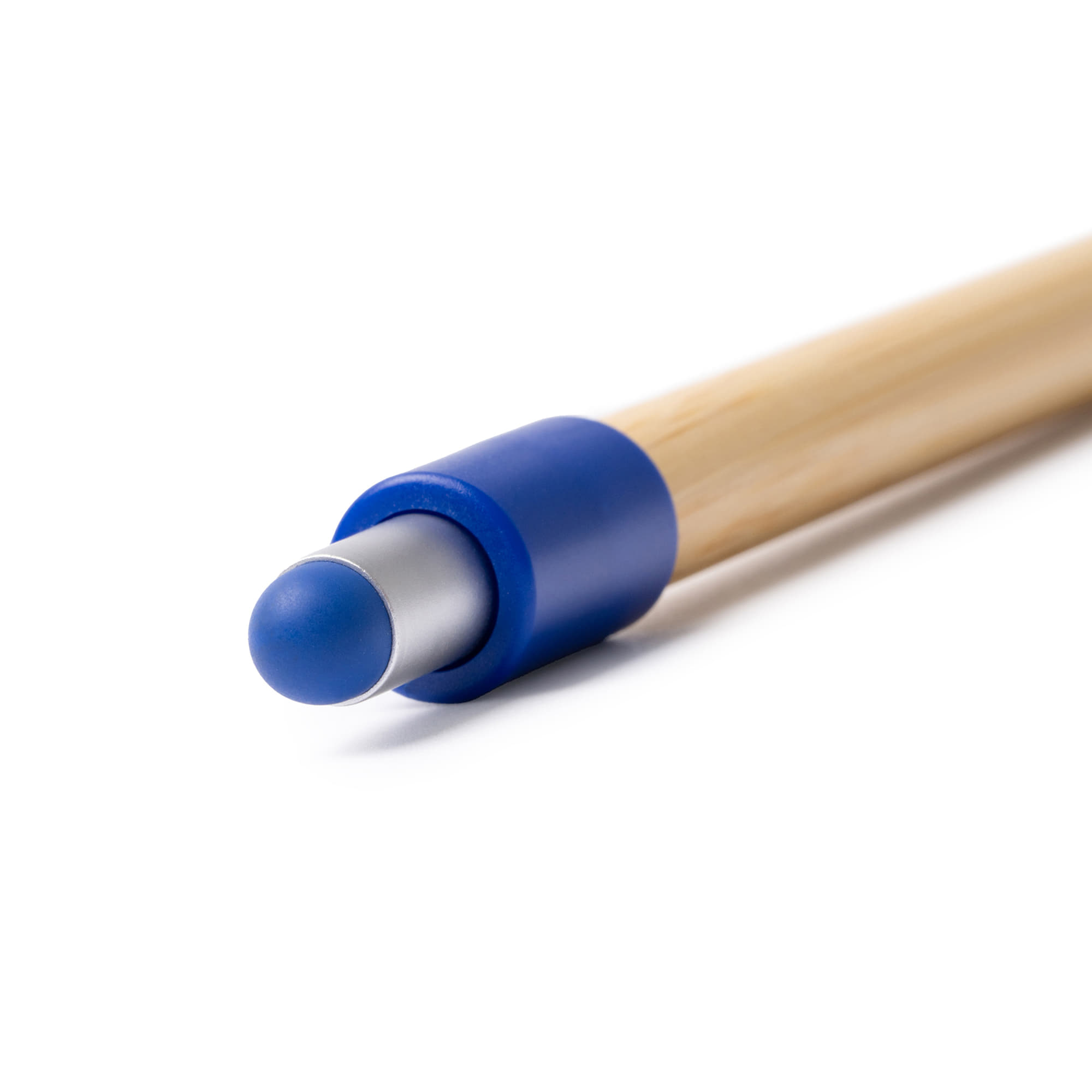 Bolígrafo con función spinner antiestrés. Cuerpo elaborado en bambú y puntero táctil con detalles en acabado metálico mate. Carga jumbo de tinta azul.