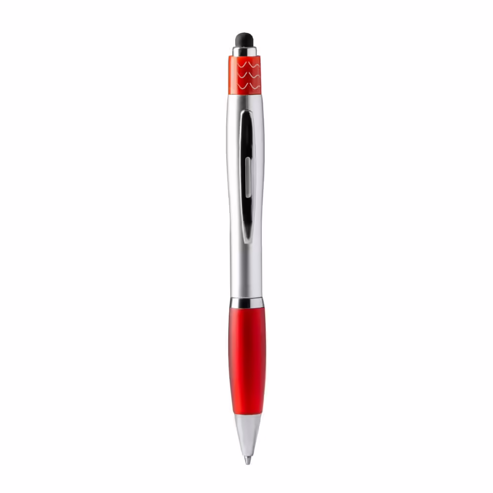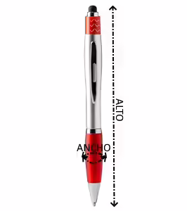 Bolígrafo giratorio con spinner antiestrés. Cuerpo elaborado en ABS y clip metálico. Cómoda empuñadura a color. Puntero táctil y acabado metalizado. Tinta azul.