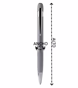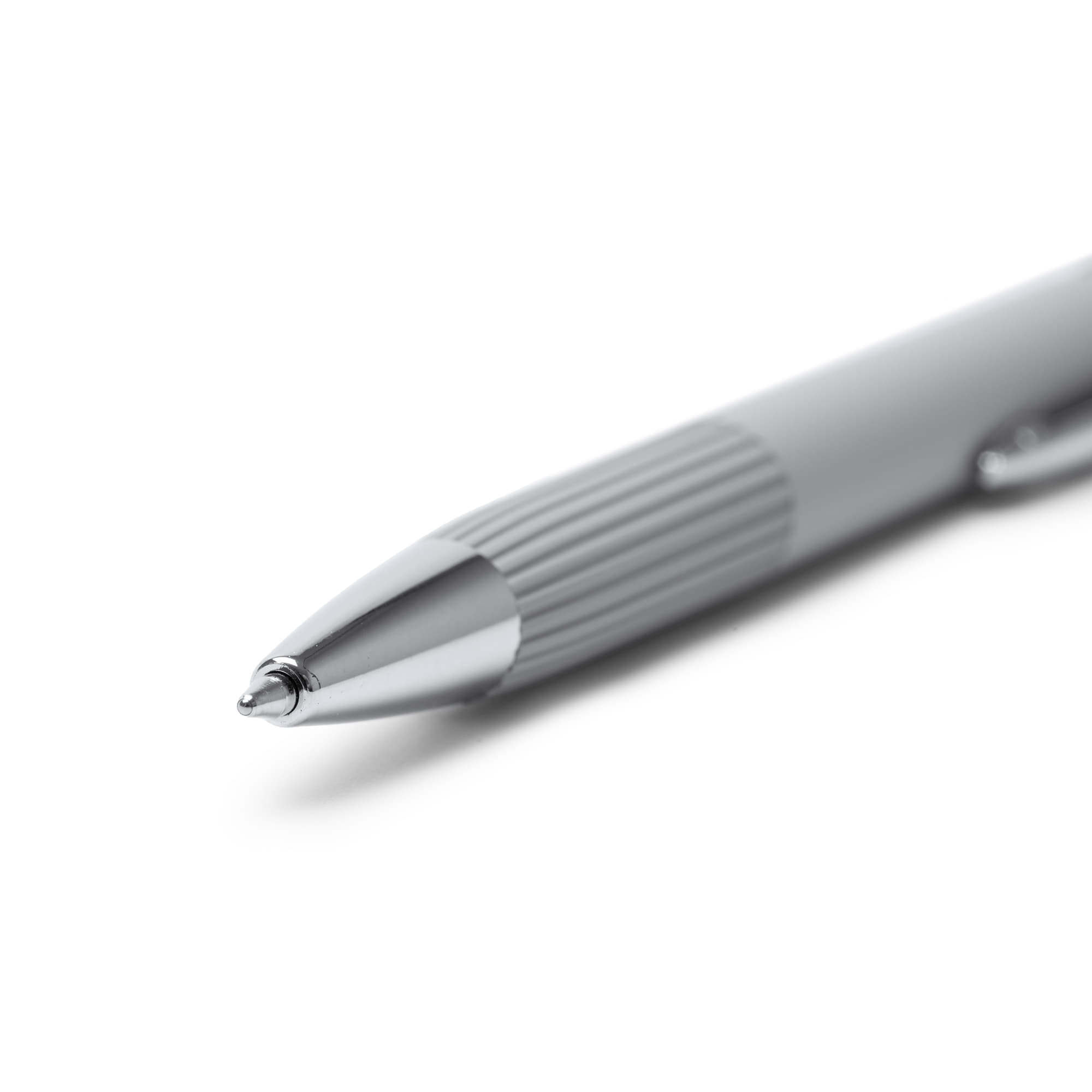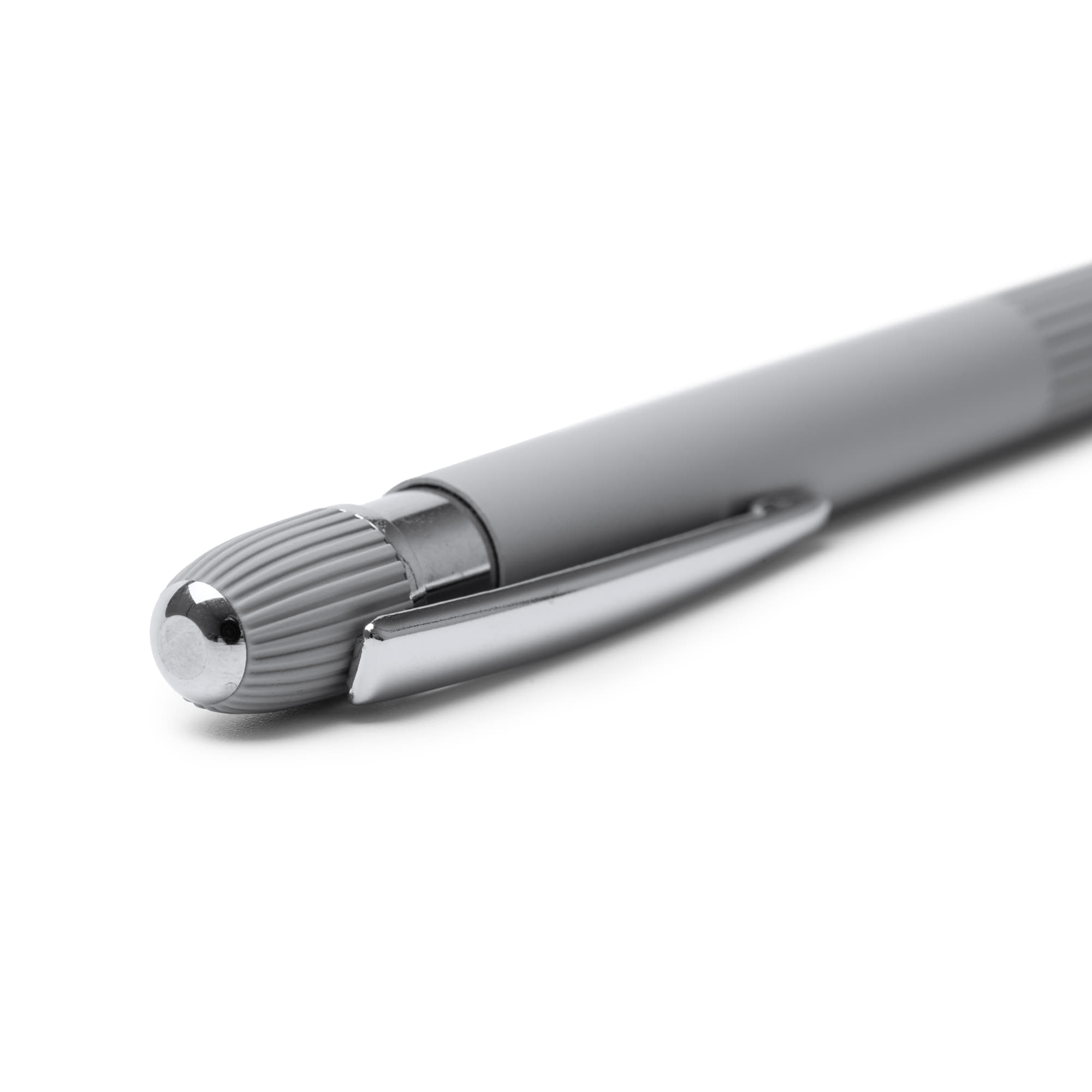 Bolígrafo con cuerpo de aluminio reciclado con agarre rayado y acabado con tacto goma mate. Detalles en acabado cromado. Carga jumbo de tinta azul.