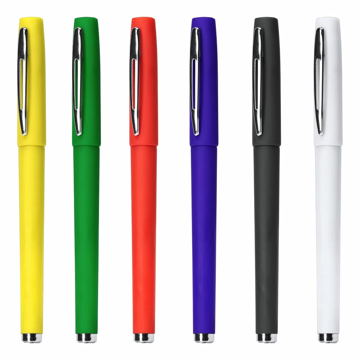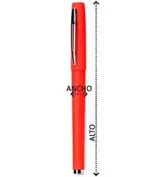 Bolígrafo tipo roller con clip metálico y punta de acero. Cuerpo de vivos colores con tacto suave en acabado goma. Carga jumbo de 0,7mm con tinta azul.