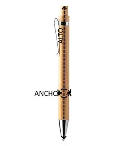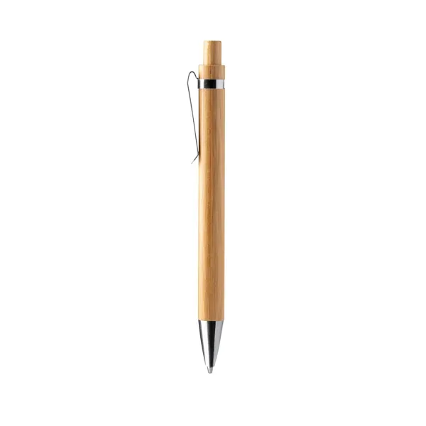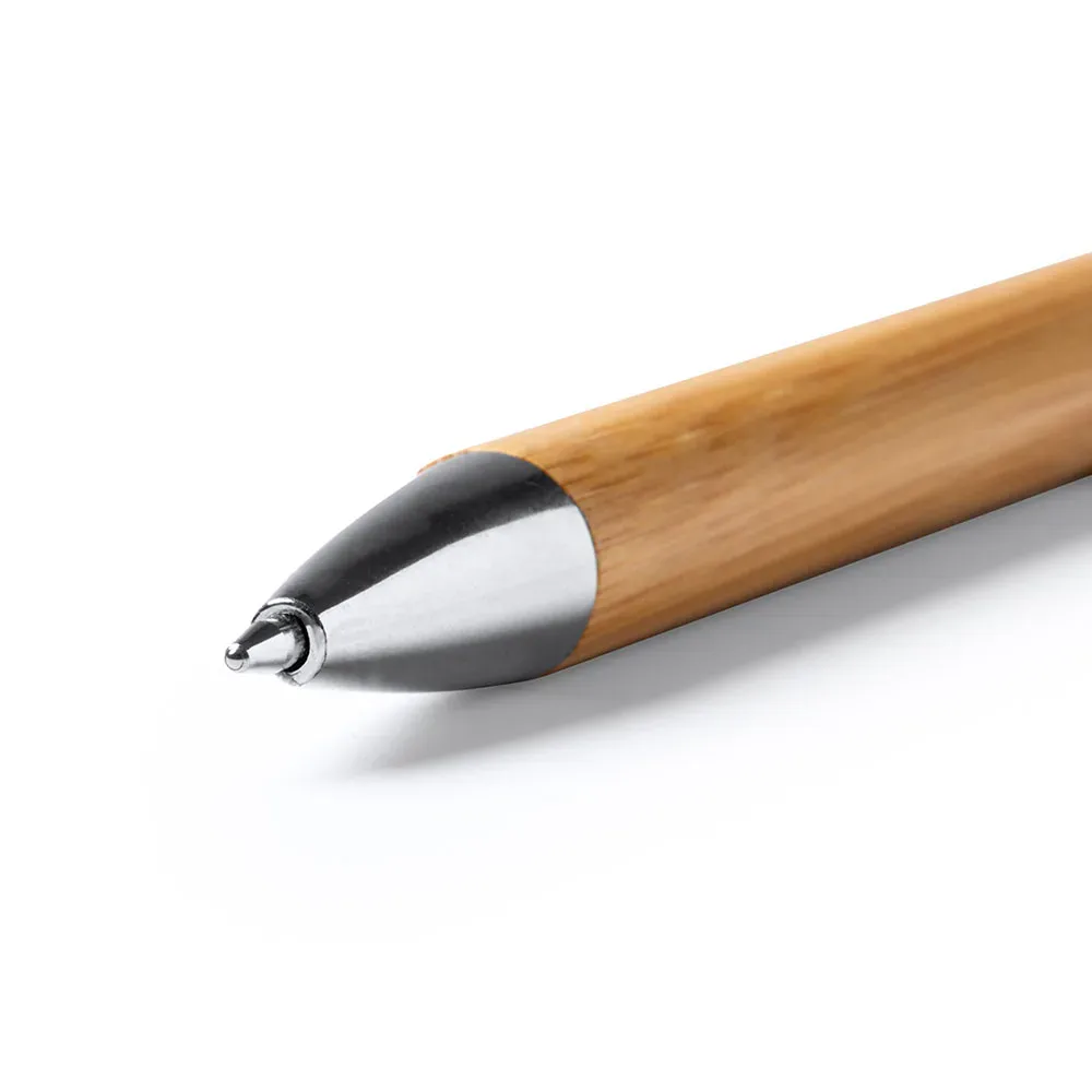 Bolígrafo realizado en bambú con detalles en aluminio. Tinta azul.