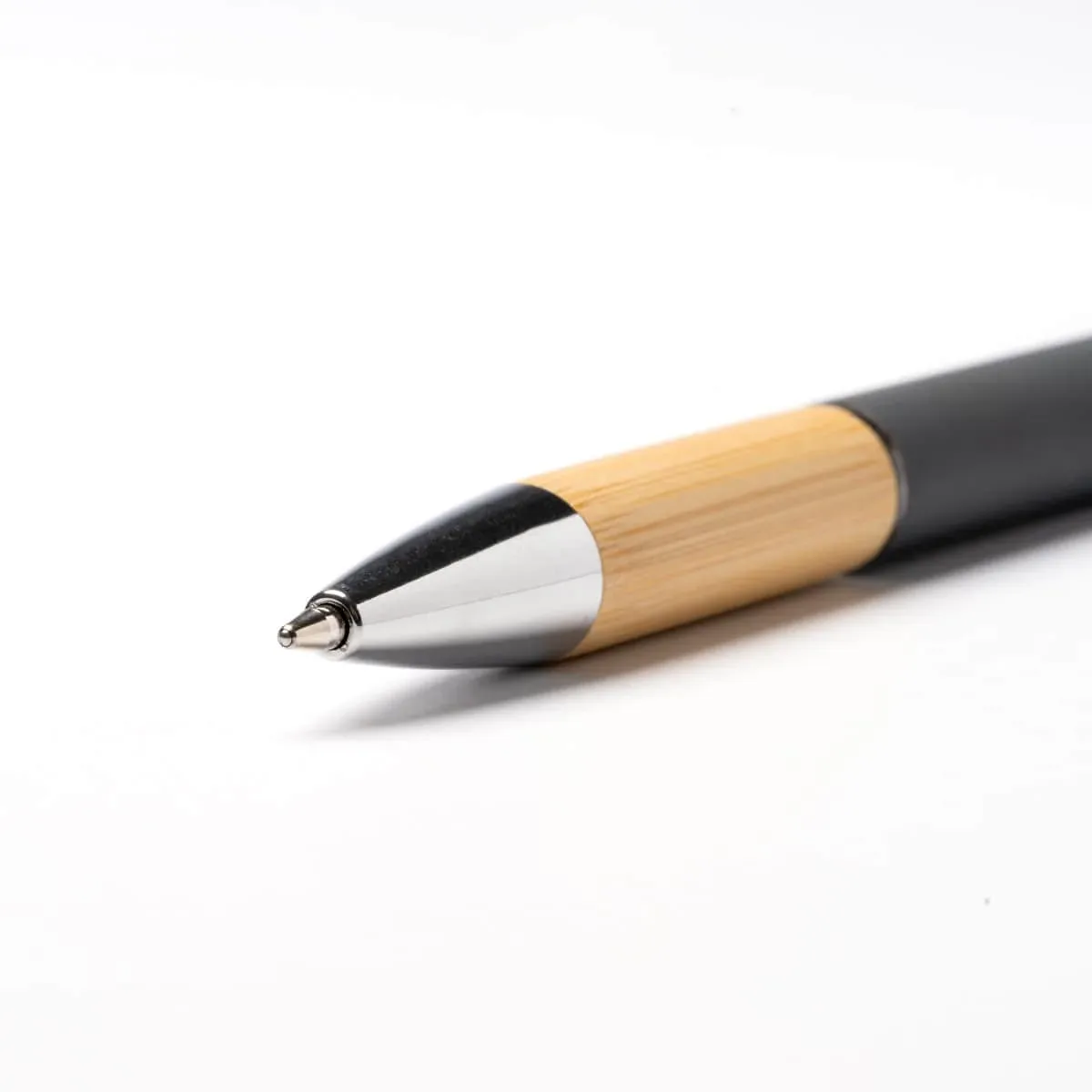Bolígrafo con cuerpo elaborado en aluminio con empuñadura en bambú. Pulsador, punta y detalles en acabado cromado. Con detalle en el extremo del pulsador en color negro. Tinta azul.