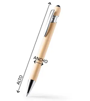 Bolígrafo con cuerpo elaborado en bambú y pulsador en acabado metálico. Con puntero táctil incorporado y mecanismo pulsador. Tinta azul.