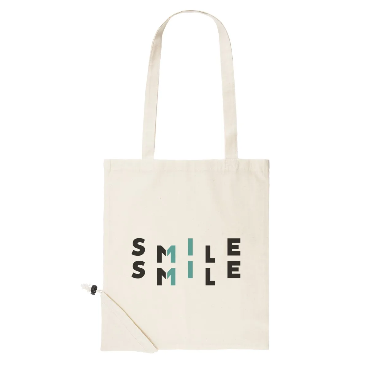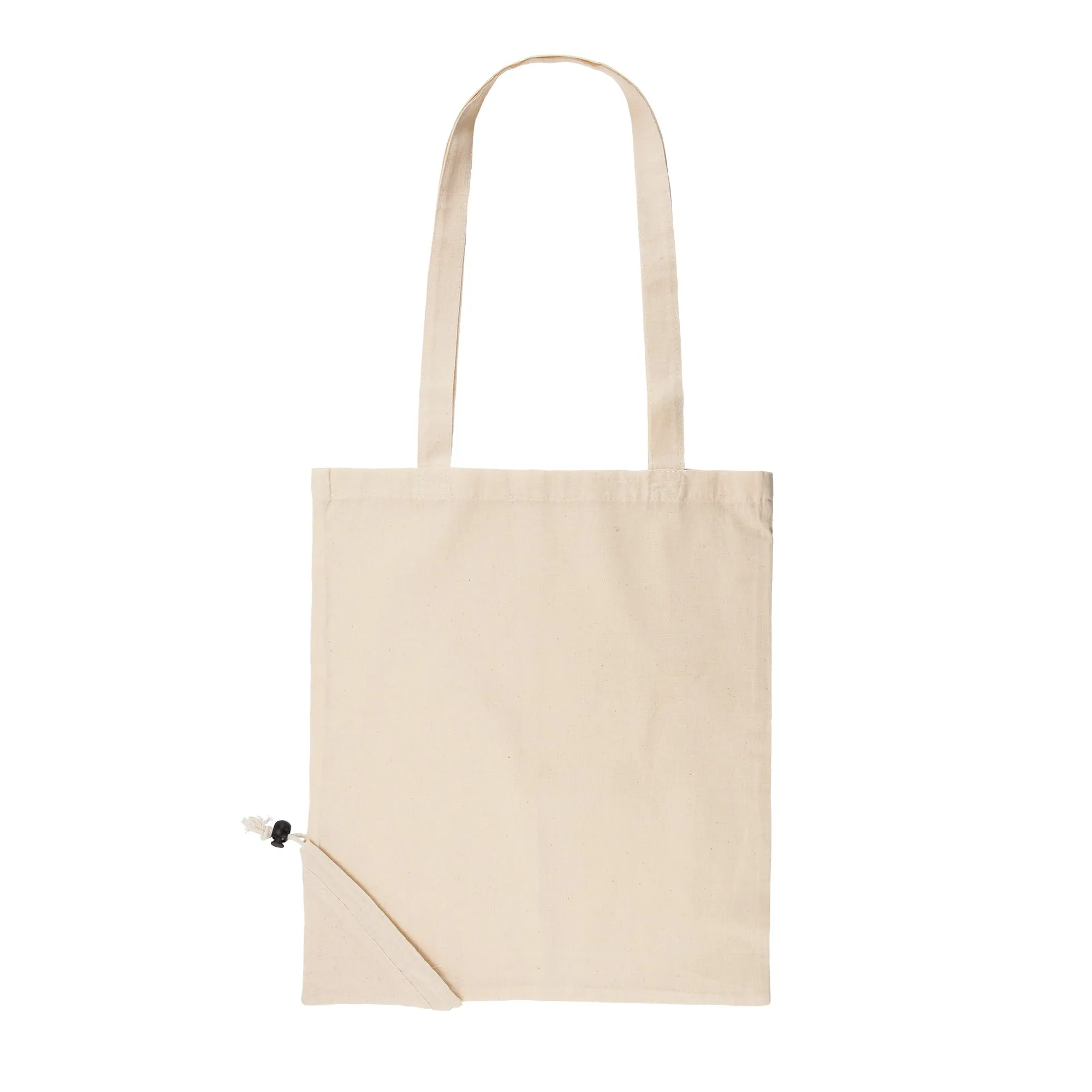 Bolsa de la compra plegable de 105 g/m², 100% de algodón, con asas largas de 70 cm y cordón para plegado ajustable.