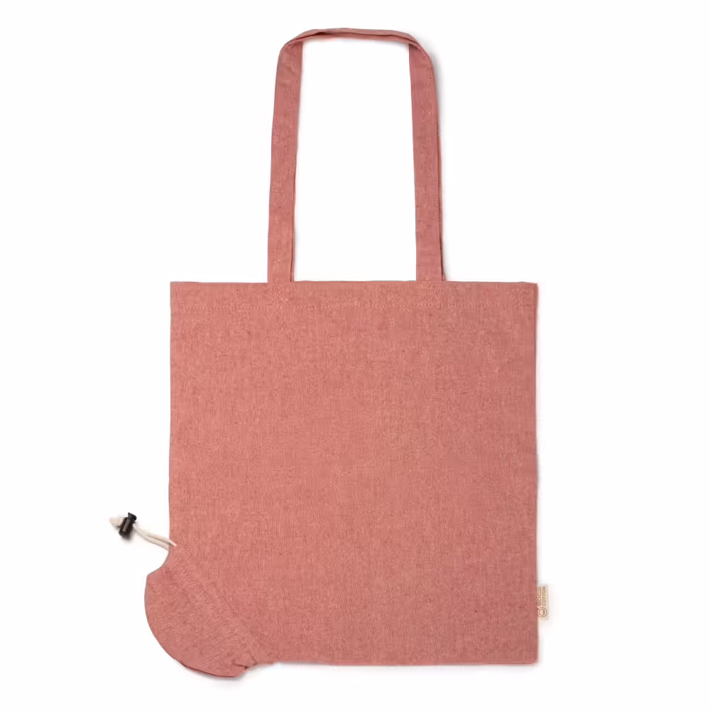 Bolsa plegable de algodón reciclado a color, con asas largas de 70 cm. Incorporado incluye un cordón que permite que la bolsa se pliegue desde la esquina inferior y conseguir mayor versatilidad. Esta bolsa es una opción práctica, sostenible y versátil para el transporte de tus objetos personales.