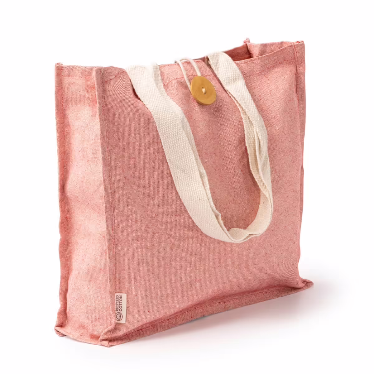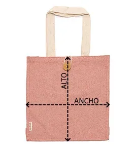 Bolsa de algodón reciclado con acabado jaspeado. Asas largas reforzadas de 70 cm. Cierre con botón.