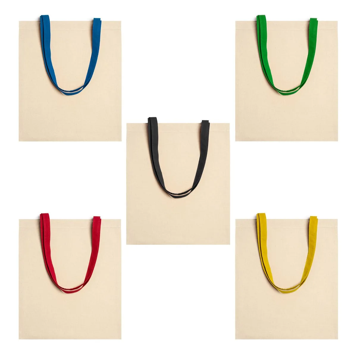 PRODUCTO QUE SE DESCATALOGARÁ CUANDO SE AGOTEN LAS EXISTENCIAS – Bolsa 100% de algodón 100 g/m². Asas largas de 70 cm a color.