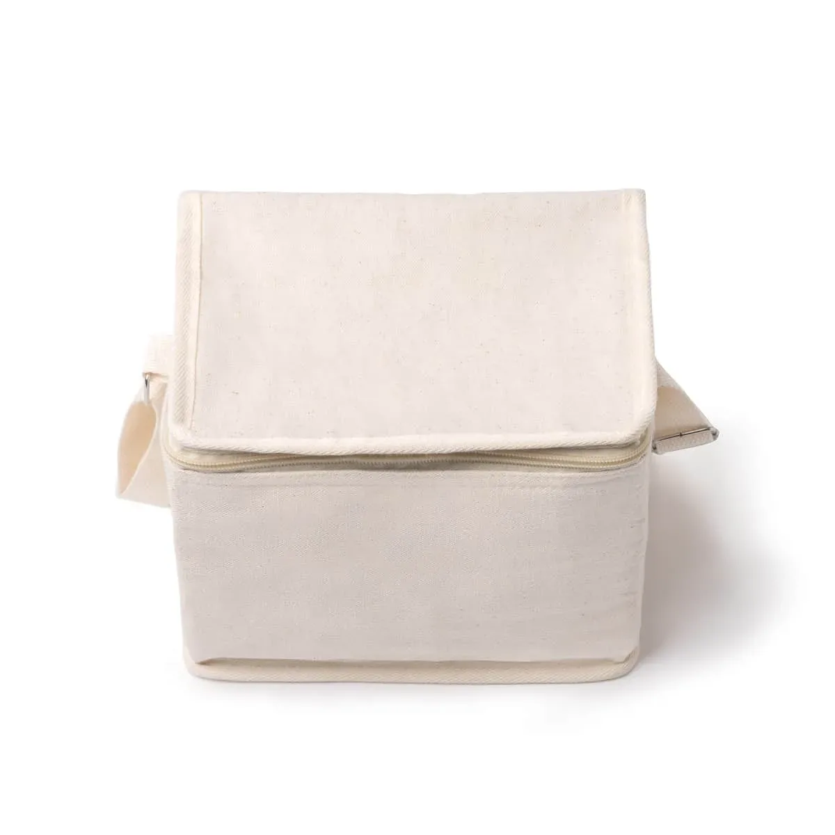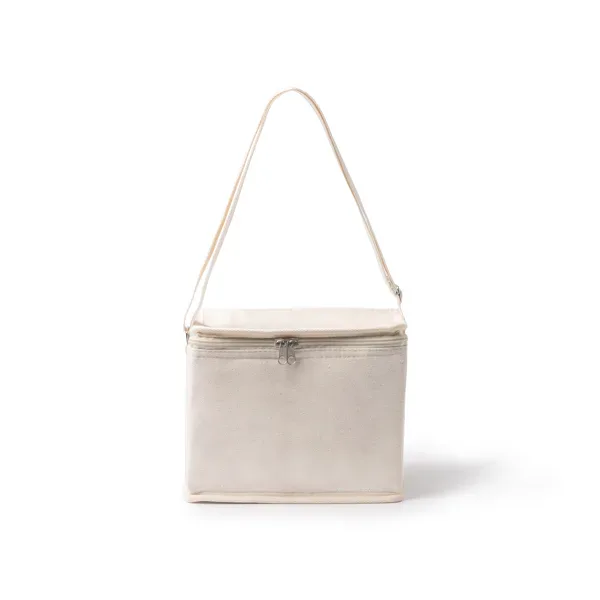 Nevera de algodón con bolsillo frontal. Bolsillo principal con interior isotérmico. Incluye cinta de transporte.