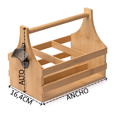 Portabotellas elaborado en bambú con abridor incorporado en el lateral y asa de agarre en la parte superior. Capacidad para 6 botellines.