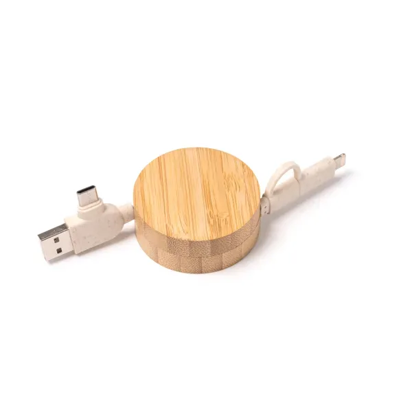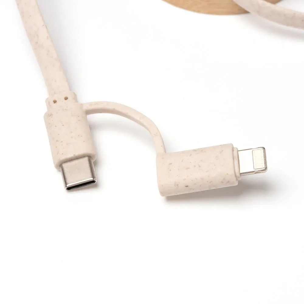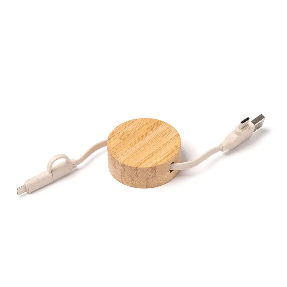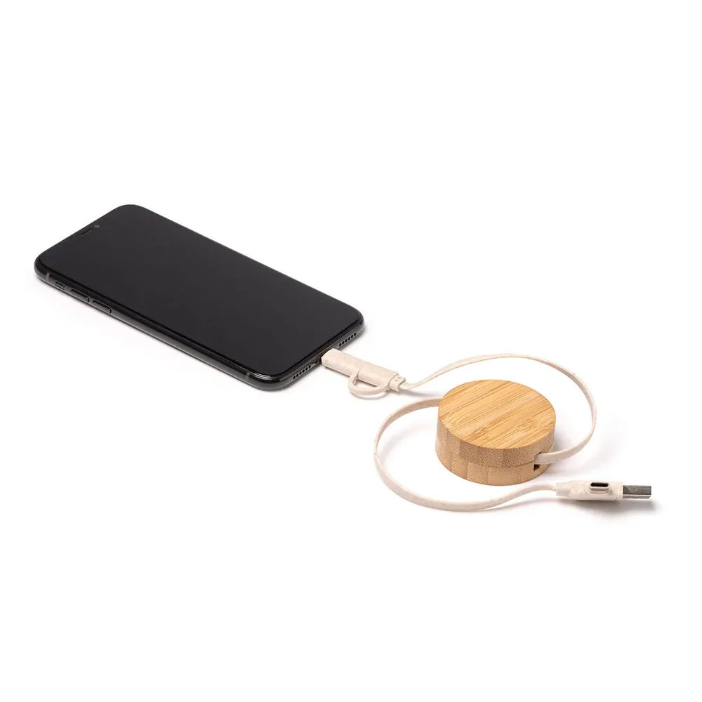 Cable cargador extensible con cuerpo de bambú y cable de fibra de trigo. Entrada USB y Tipo C. Salida Lightning y Tipo C.