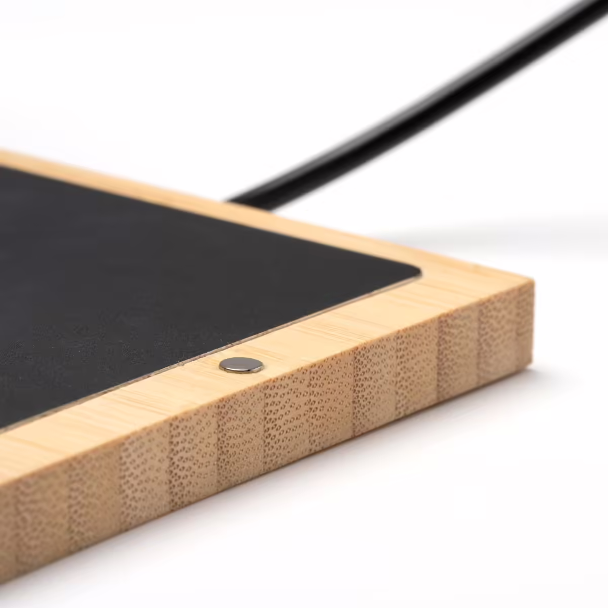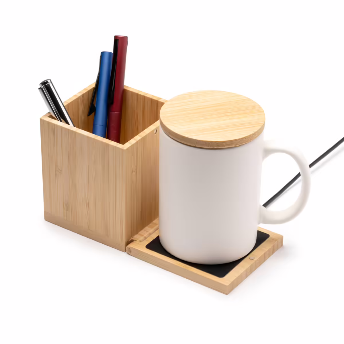 Innovador lapicero con calentador de taza plegable, realizado en cuerpo de bambú, es perfecto para mantener tu bebida a la temperatura ideal mientras organizas tus útiles de escritorio. Incluye un cable de 1 metro con salidas USB y Tipo C, proporcionando versatilidad y facilidad de uso. Su diseño plegable permite un almacenamiento y transporte sencillo. Presentado en una caja de diseño ecológico, este accesorio combina funcionalidad y sostenibilidad, ideal para cualquier entorno de trabajo moderno.