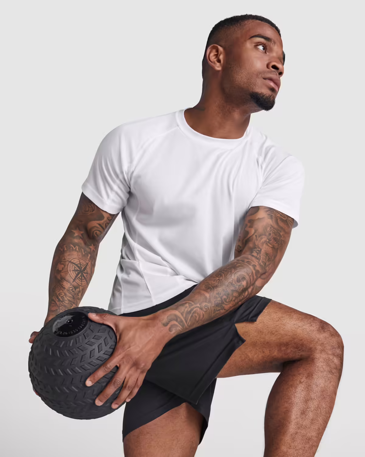 Camiseta técnica de manga corta ranglán. Escote redondeado con cubrecosturas. Cortes laterales con remallado al tono.