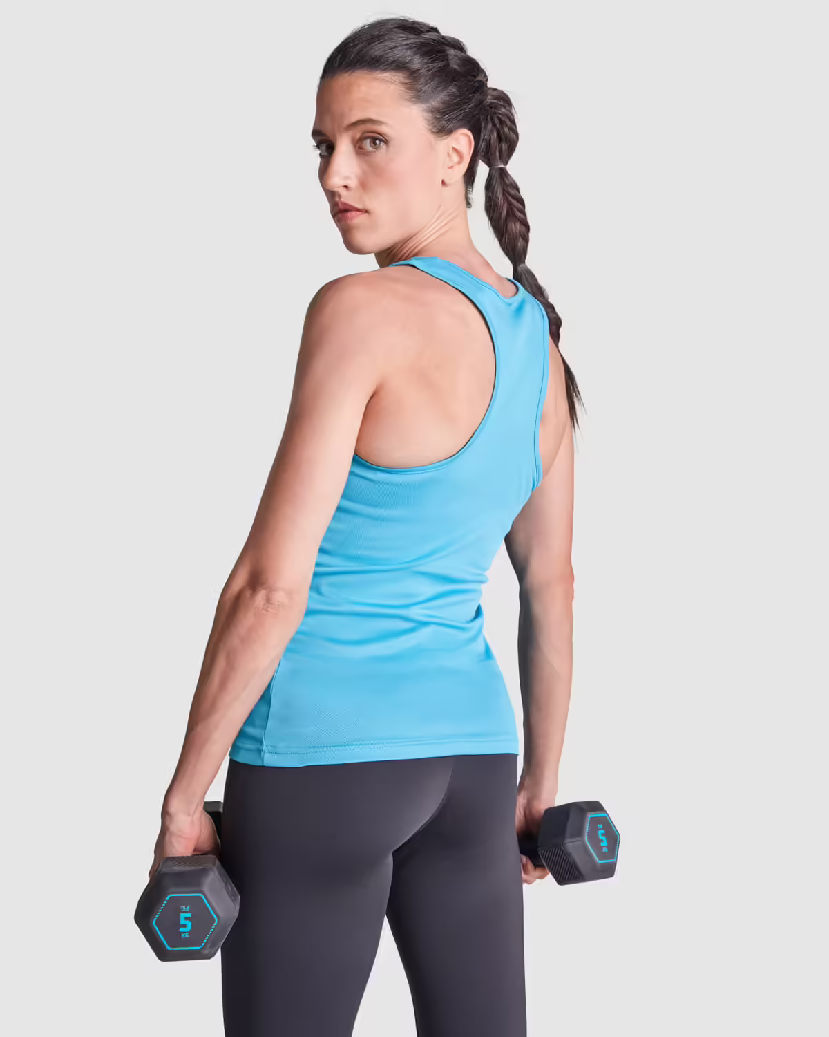 Efectivamente, la camiseta deportiva con sisa y escote ribeteado para mujer Shura de la casa Roly es como un lienzo vacío esperando que le des tu toque personal.