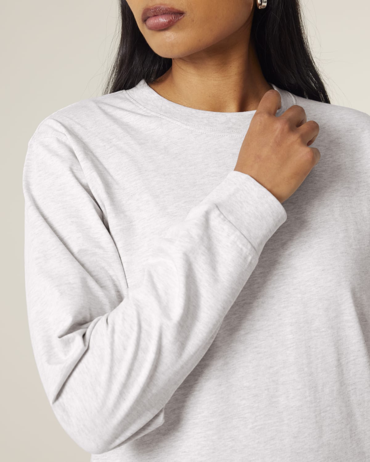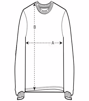 Manga montada Costilla 1×1 en el cuello Doble costura en los puños de la manga y dobladillo inferior Cinta interna en el cuello de la misma tela Característica de tela ligeramente más áspera