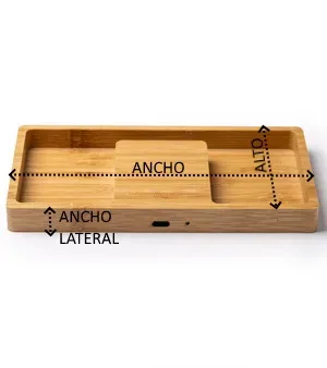 PRODUCTO QUE SE DESCATALOGARÁ CUANDO SE AGOTEN LAS EXISTENCIAS – Bandeja organizadora con cargador inalámbrico integrado en la superficie. Con potencia de carga de 10W, compatible con dispositivos provistos de esta tecnología de carga inalámbrica. Con distintos departamentos para objetos y soporte para situar el smartphone en posición vertical. Cable Tipo C para conexión incluido.