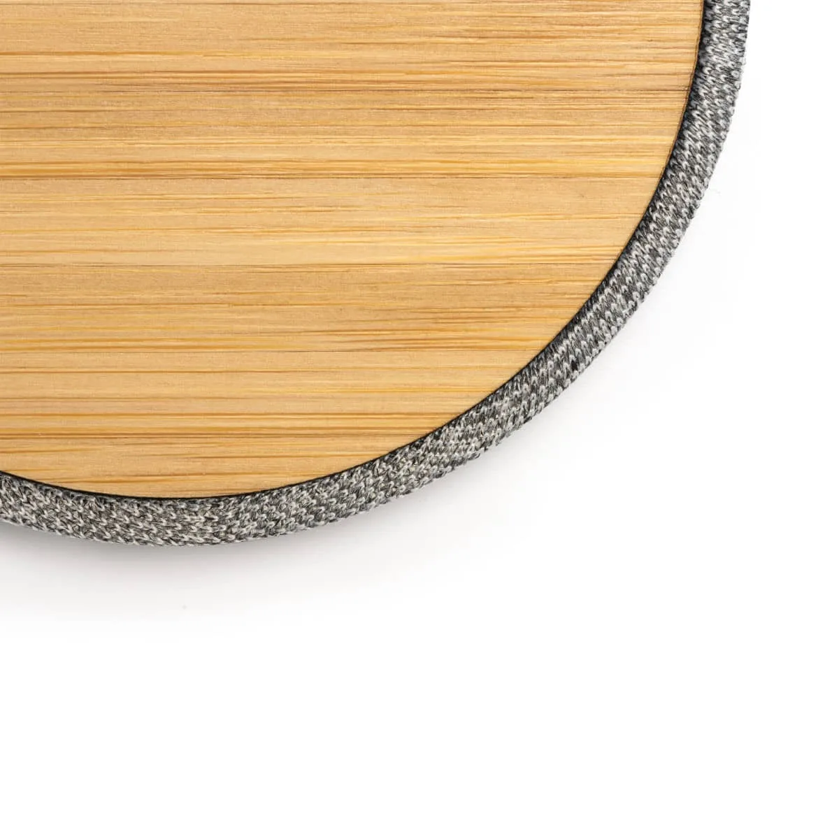 PRODUCTO QUE SE DESCATALOGARÁ CUANDO SE AGOTEN LAS EXISTENCIAS – Fantástico cargador inalámbrico con cuerpo de bambú y tejido RPET. Compatible con modelos con tecnología de carga inalámbrica. Salida 10W. Conexión Tipo C. Cable incluido.