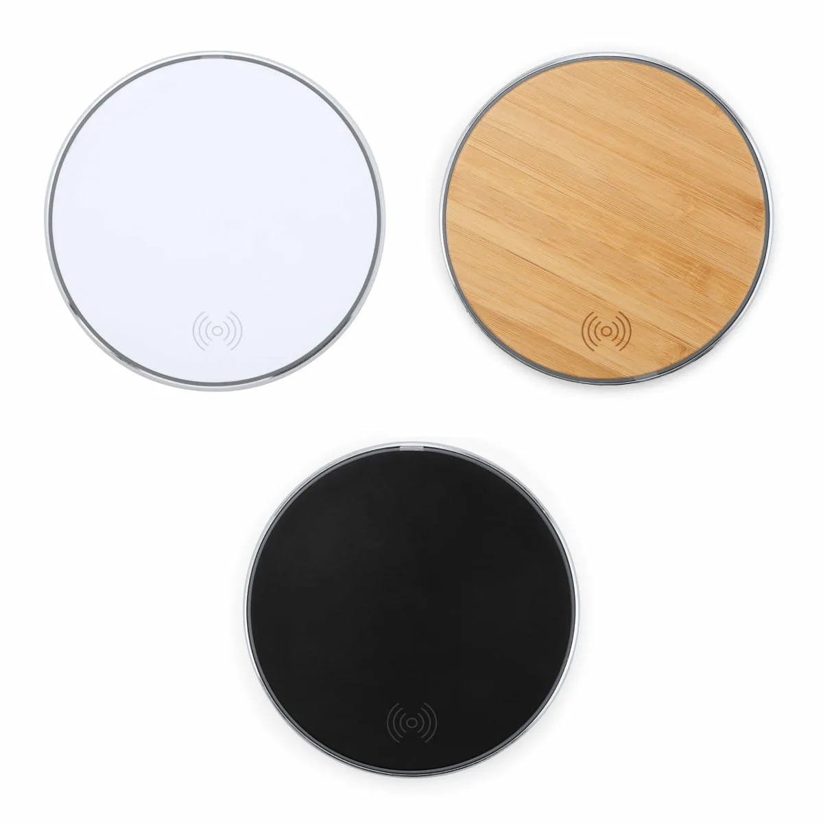 Cargador inalámbrico con cuerpo en aluminio. Conecte el dispositivo, coloque su smartphone sobre él y déjelo cargar. Una luz le indicará que está cargando. Compatible con modelos con tecnología de carga inalámbrica. DC5V/1.0A. Cable incluido. Presentado en caja diseño.