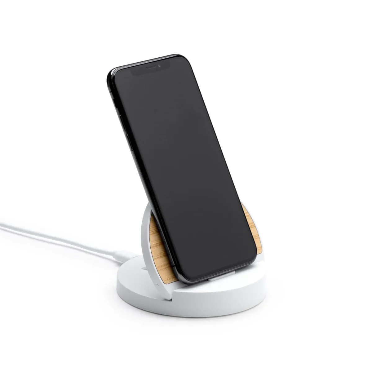 PRODUCTO QUE SE DESCATALOGARÁ CUANDO SE AGOTEN LAS EXISTENCIAS – Cargador inalámbrico de 10W con cuerpo elaborado en ABS y superficie de carga en bambú. La base de carga es plegable, incorporándose en vertical para poder colocar el dispositivo en la misma posición. Con indicador luminoso de estado de carga. Compatible con dispositivos provistos de esta tecnología. Con cable de conexión Tipo C incluido.