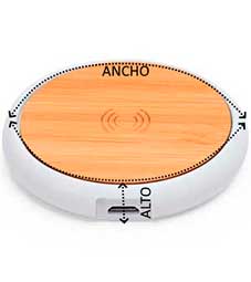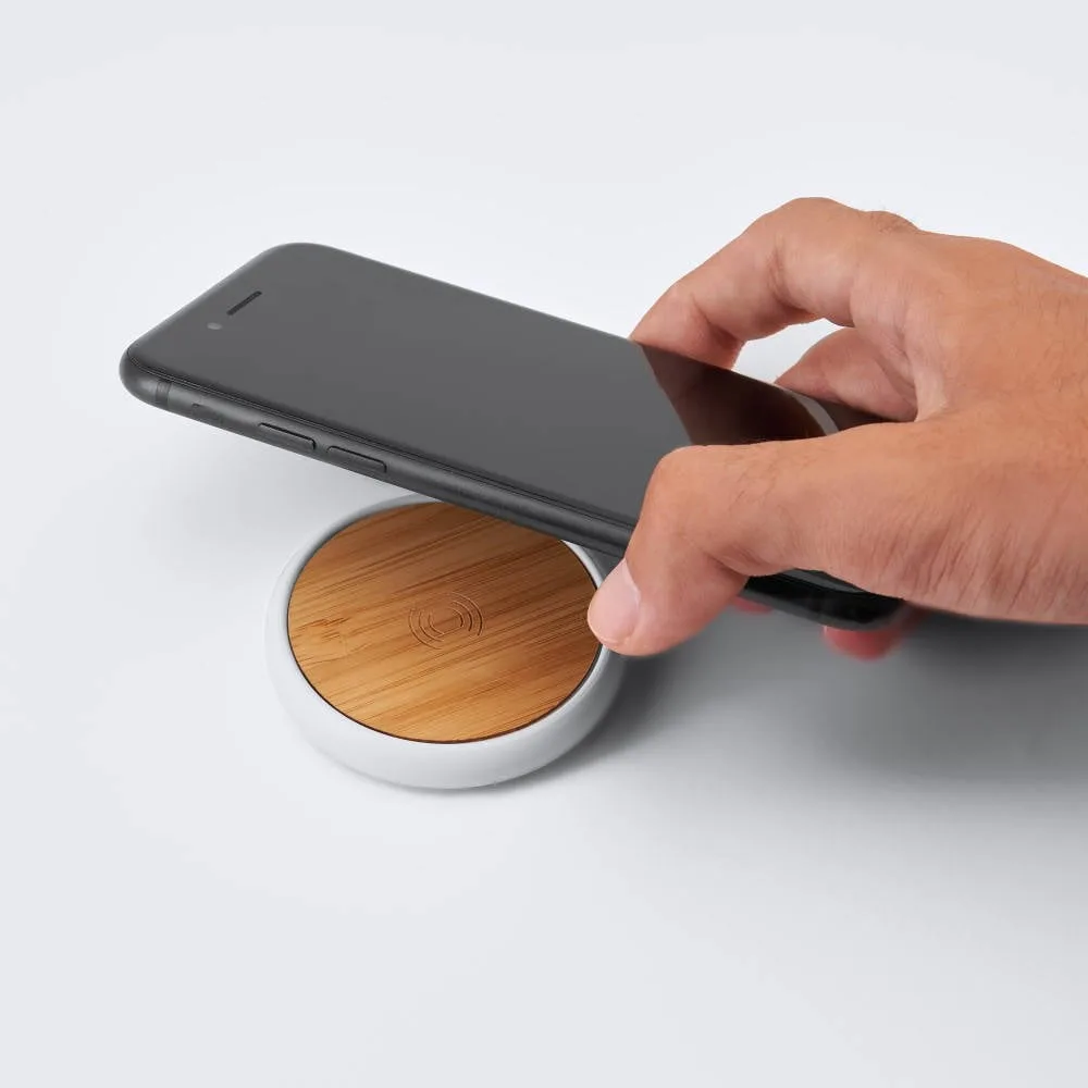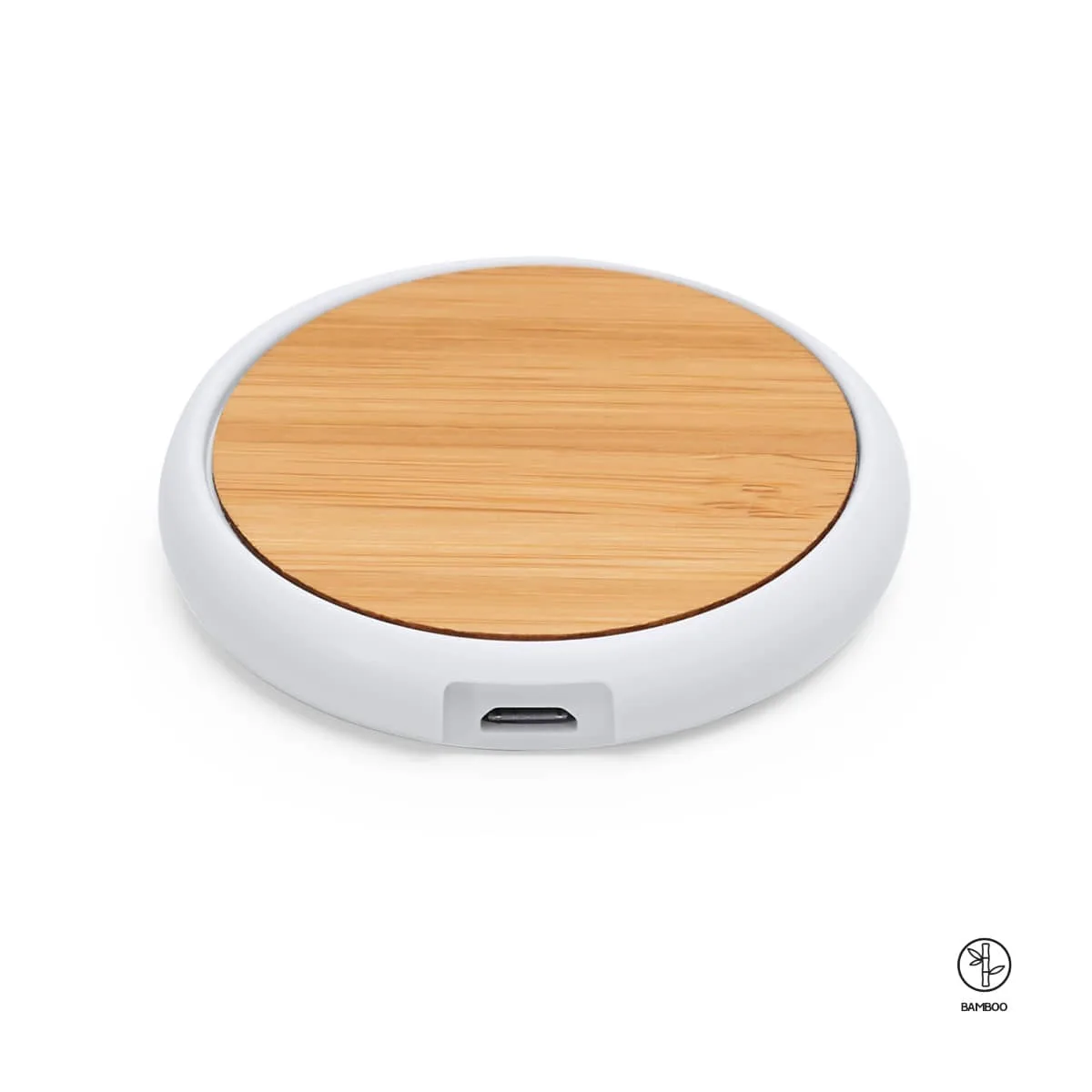 Cargador inalámbrico 5W con cuerpo de ABS blanco y superficie de bambú natural. Coloque su Smartphone sobre el y déjelo cargar. Cable incluido.