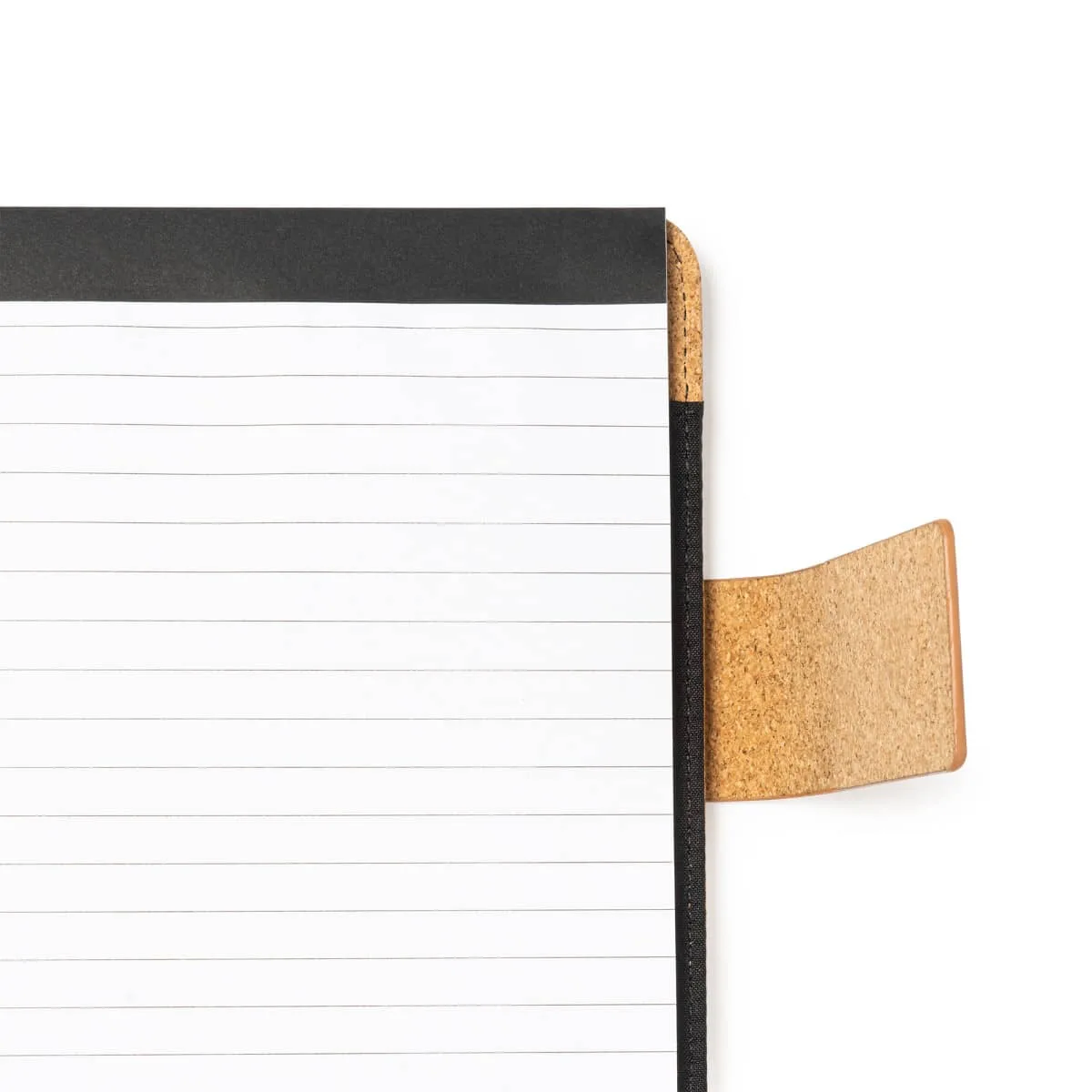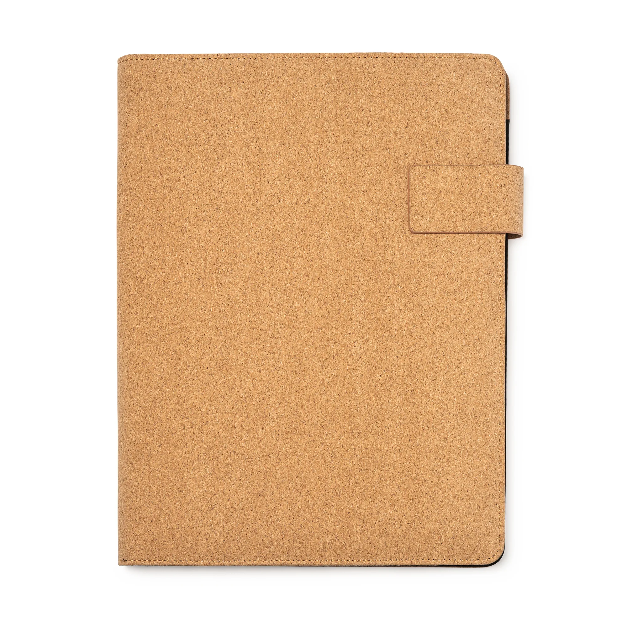 Carpeta A4 multiusos de corcho natural con cierre magnético. Incluye bloc extraíble de 30 hojas a una raya, 4 compartimentos interiores y soporte para bolígrafo.