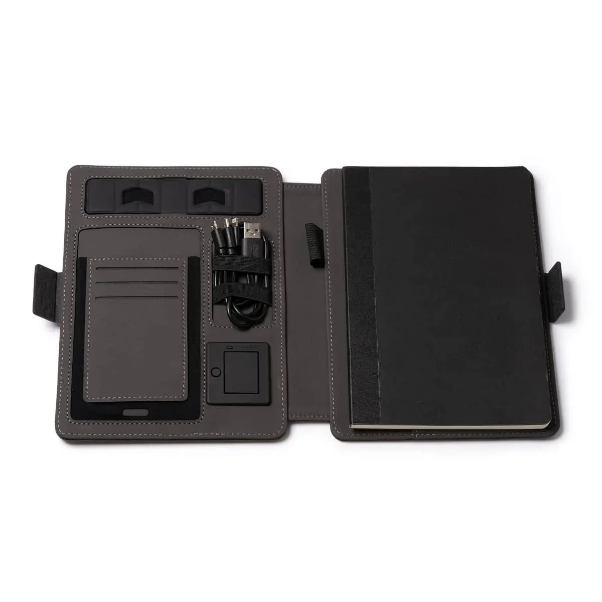 Con su cierre magnético, la carpeta asegura que tus documentos y pertenencias se mantengan seguros en su interior. Además, cuenta con un cargador inalámbrico incorporado en la tapa, lo que te permite cargar de forma conveniente tus dispositivos compatibles con tecnología inalámbrica.