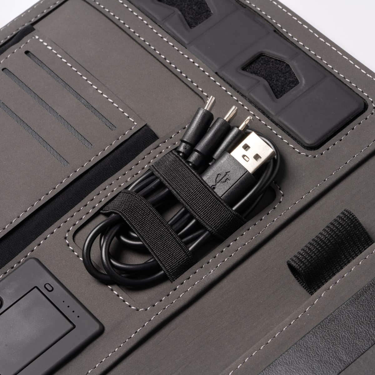La carpeta también cuenta con un práctico soporte para el bolígrafo, asegurando que siempre tengas uno a mano cuando lo necesites. Además, se incluye un cable con 3 entradas (tipo C y salida USB), lo que te permite cargar diferentes dispositivos y asegura la compatibilidad con varios dispositivos electrónicos.