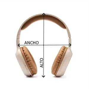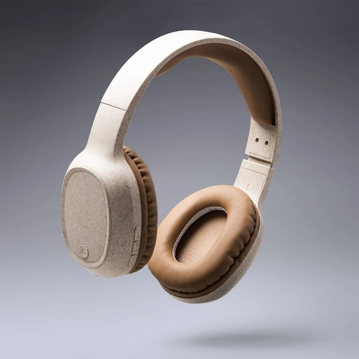 Auriculares inalámbricos realizados en fibra de trigo. Acolchado superior y almohadillas en polipiel. Plegables. Panel de control integrado con tecnología estéreo. Función manos libres y radio FM. Batería Recargable. Cable incluido.